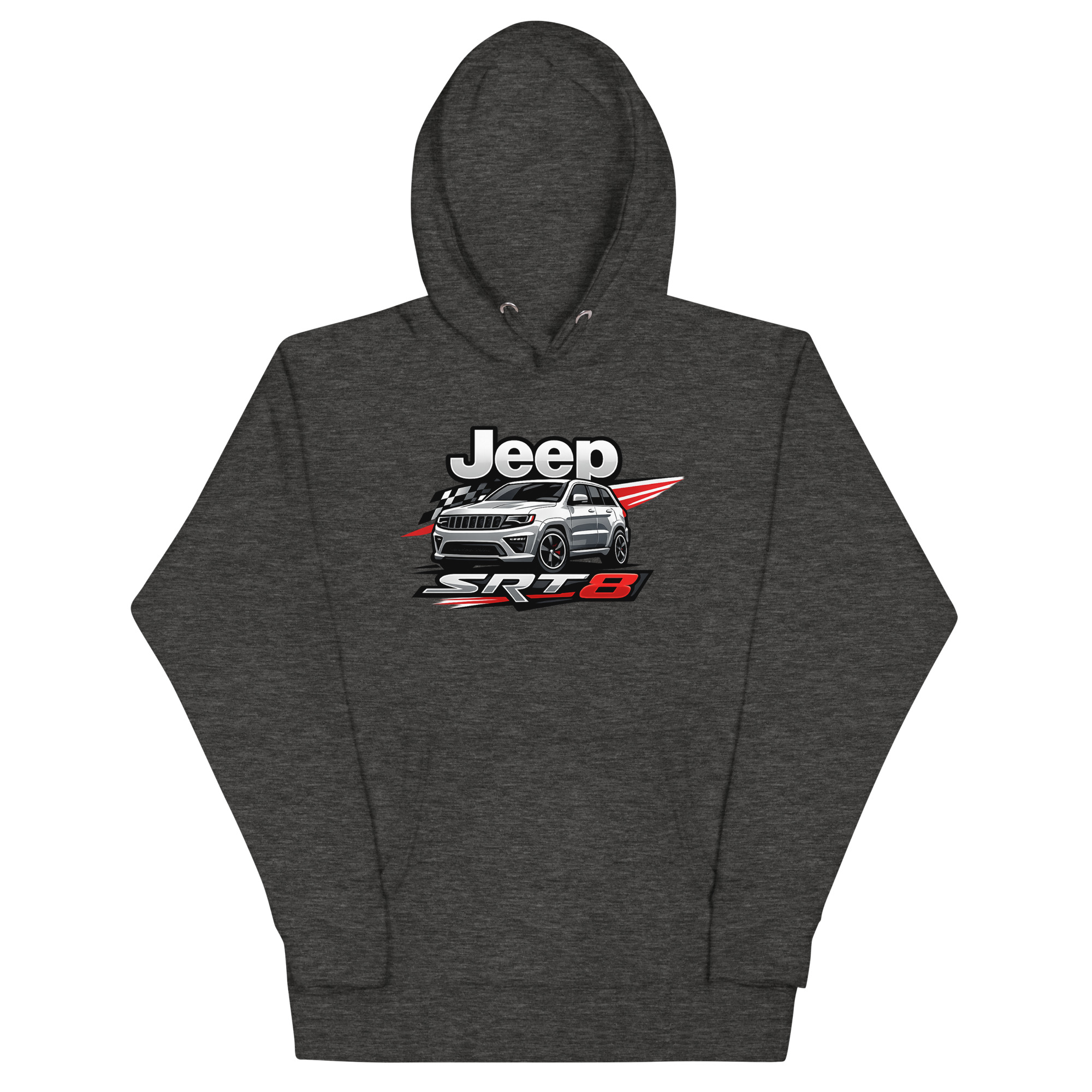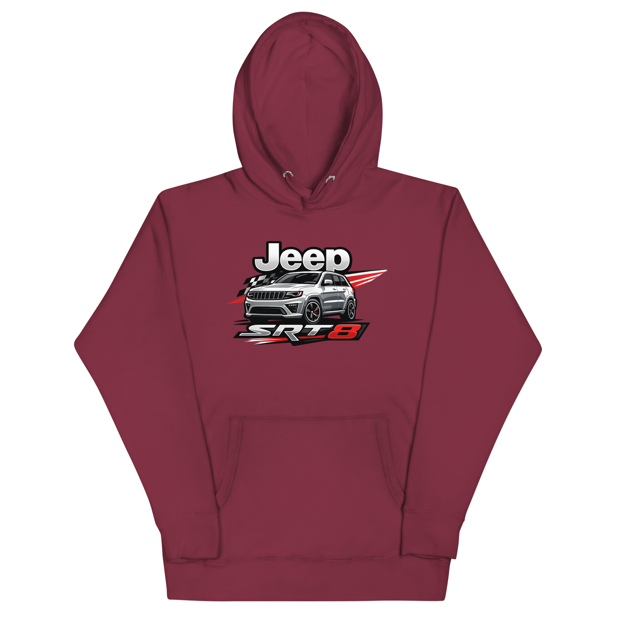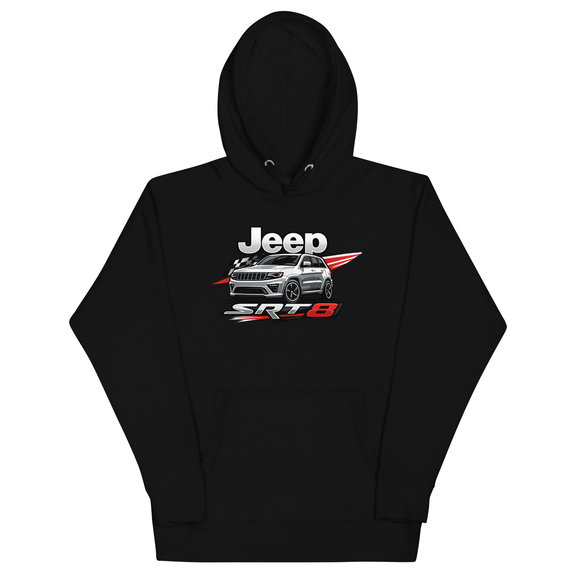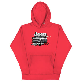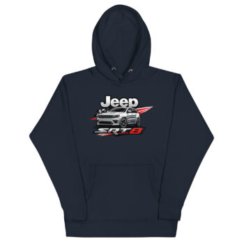 This is a premium hoodie featuring a dynamic, racing-inspired graphic of a Jeep Grand Cherokee SRT8. This specific Jeep SRT8 hoodie stands out by focusing on the vehicle’s high-performance muscle, not just its off-road capability. It’s crafted for SRT8 owners, Mopar performance fans, and anyone who appreciates the powerful blend of luxury and raw horsepower.