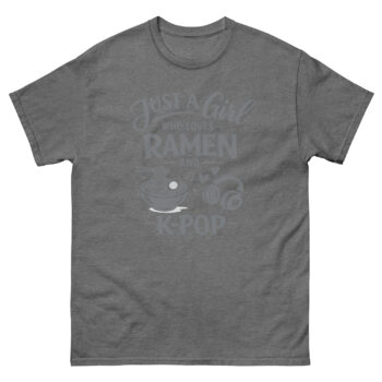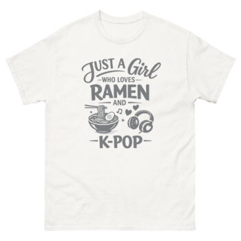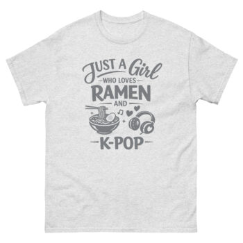 This is a best cotton t-shirt featuring a stylish, minimalist design that combines two popular passions. It’s unique for its clean gray-scale artwork, making it a subtle piece of fandom fashion. The Just A Girl Who Loves Ramen and K-pop T Shirt is designed for Hallyu fans and foodie merch lovers who want a modern way to show their interests.