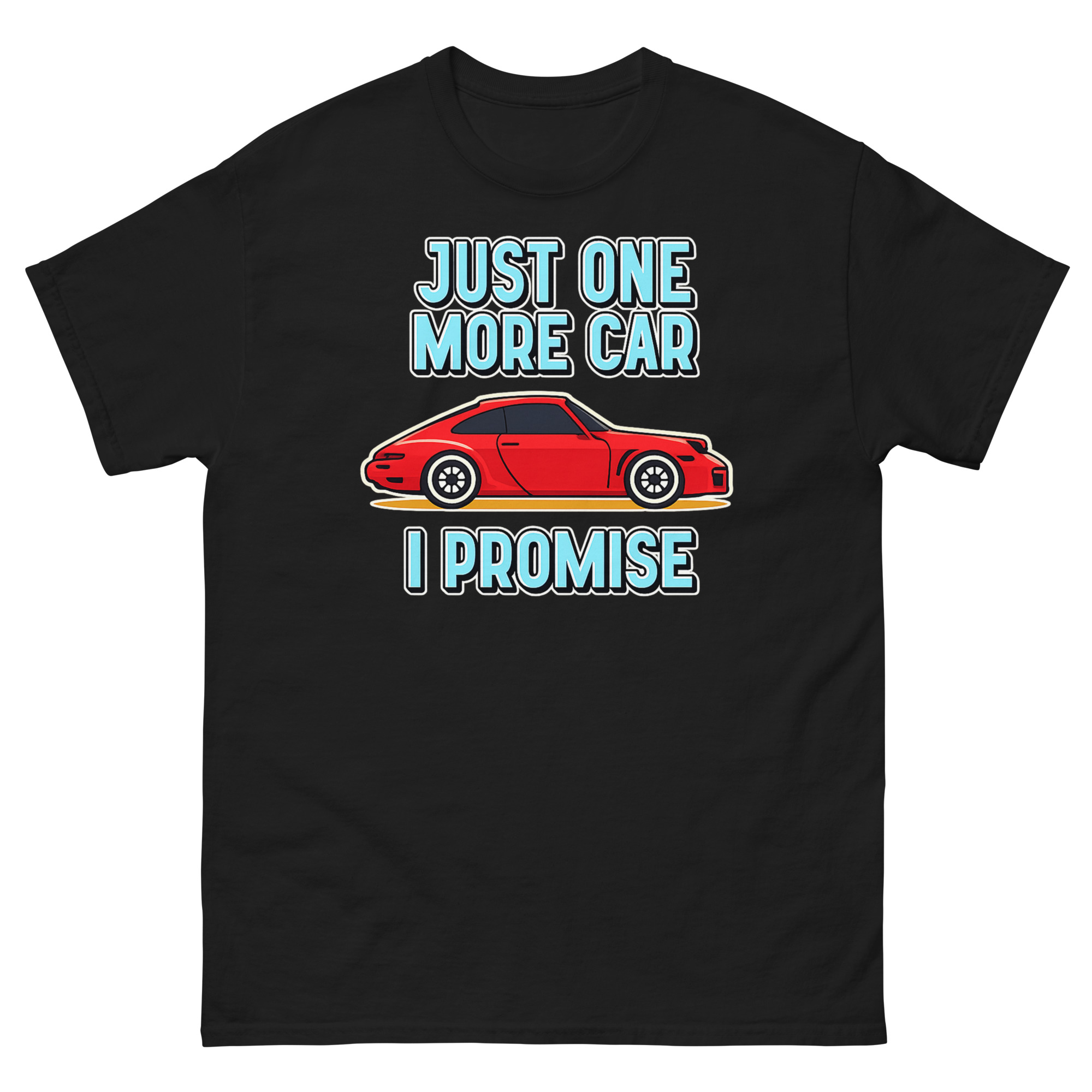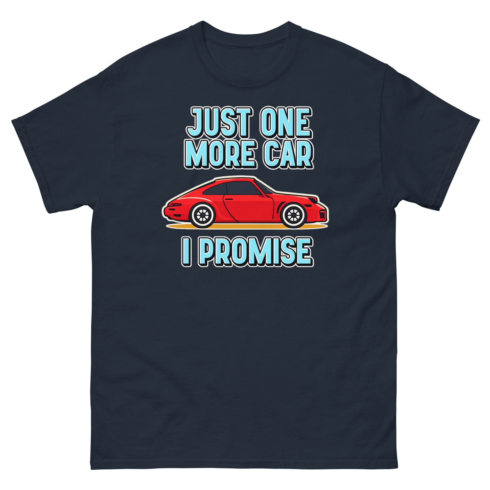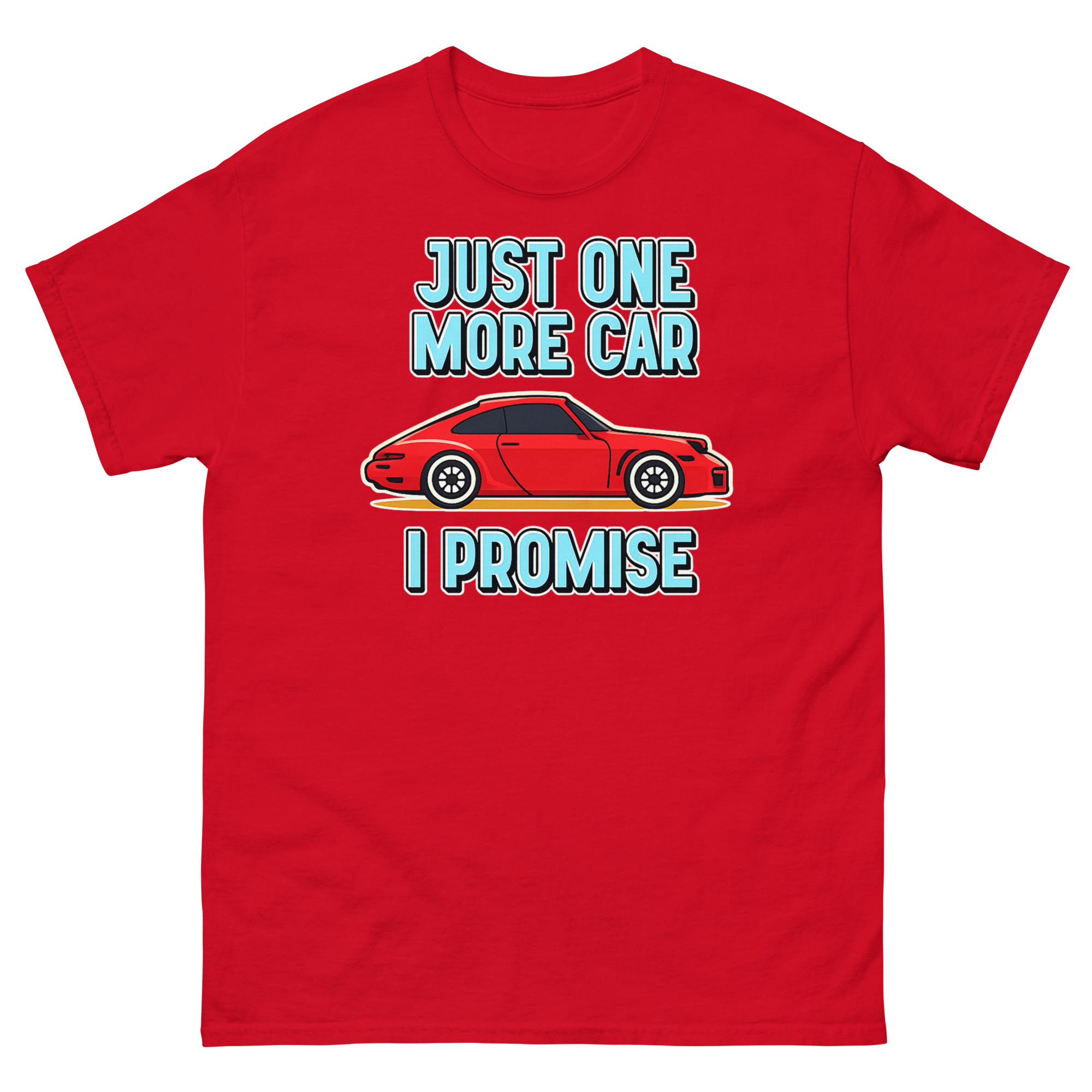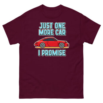 Let’s be honest: for some people, a garage never feels quite full. This Just One More Car I Promise T Shirt design comes directly from those endless conversations about the “next” car, the “dream” project, or the “final” purchase that somehow never is. The bold red cartoon sports car is that irresistible find, the one that makes you smile just thinking about it. Paired with the cheeky, chunky lettering of “JUST ONE MORE CAR I PROMISE,” it turns a common inside joke among gearheads into wearable art. It’s not just a graphic; it’s a nod to the passion that fuels weekend restorations, spontaneous bids at auctions, and the perpetual hunt for the next great ride. Whether you’re the husband with a driveway full of projects or the friend always planning for the next car club event, this tee gets it.