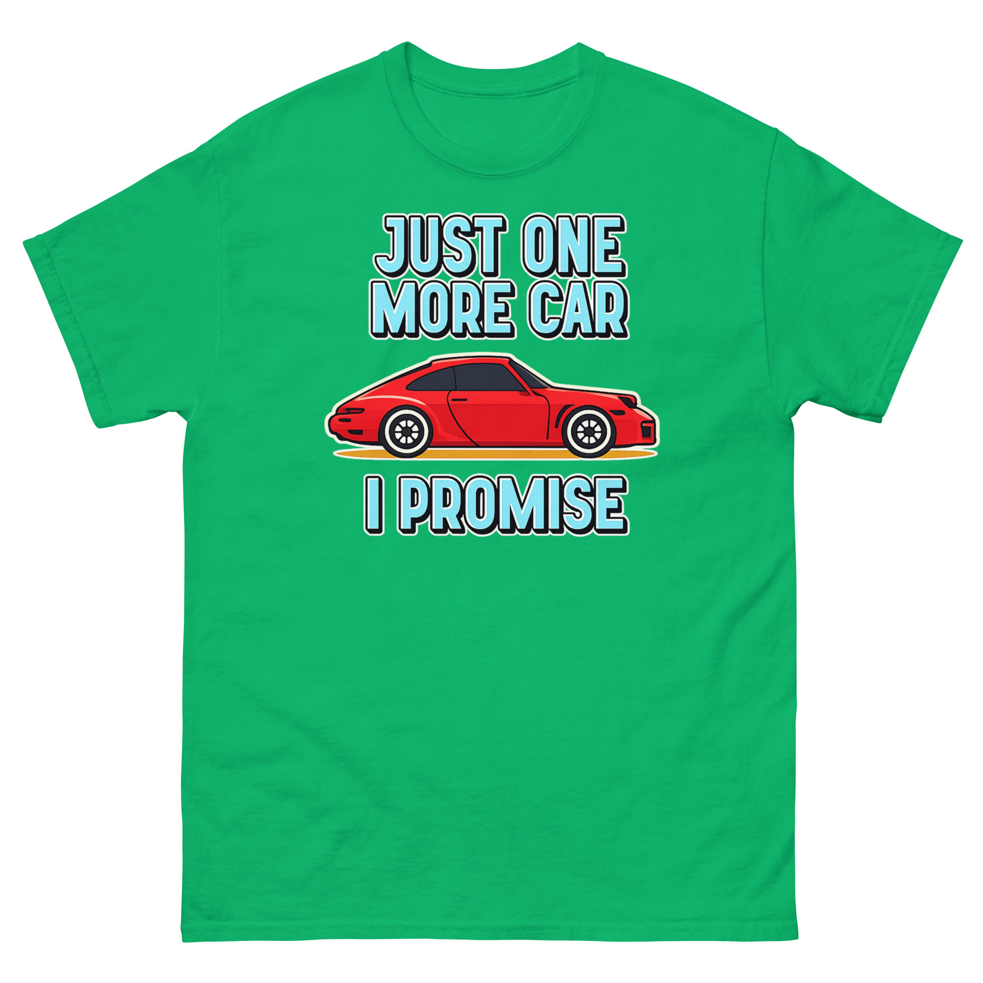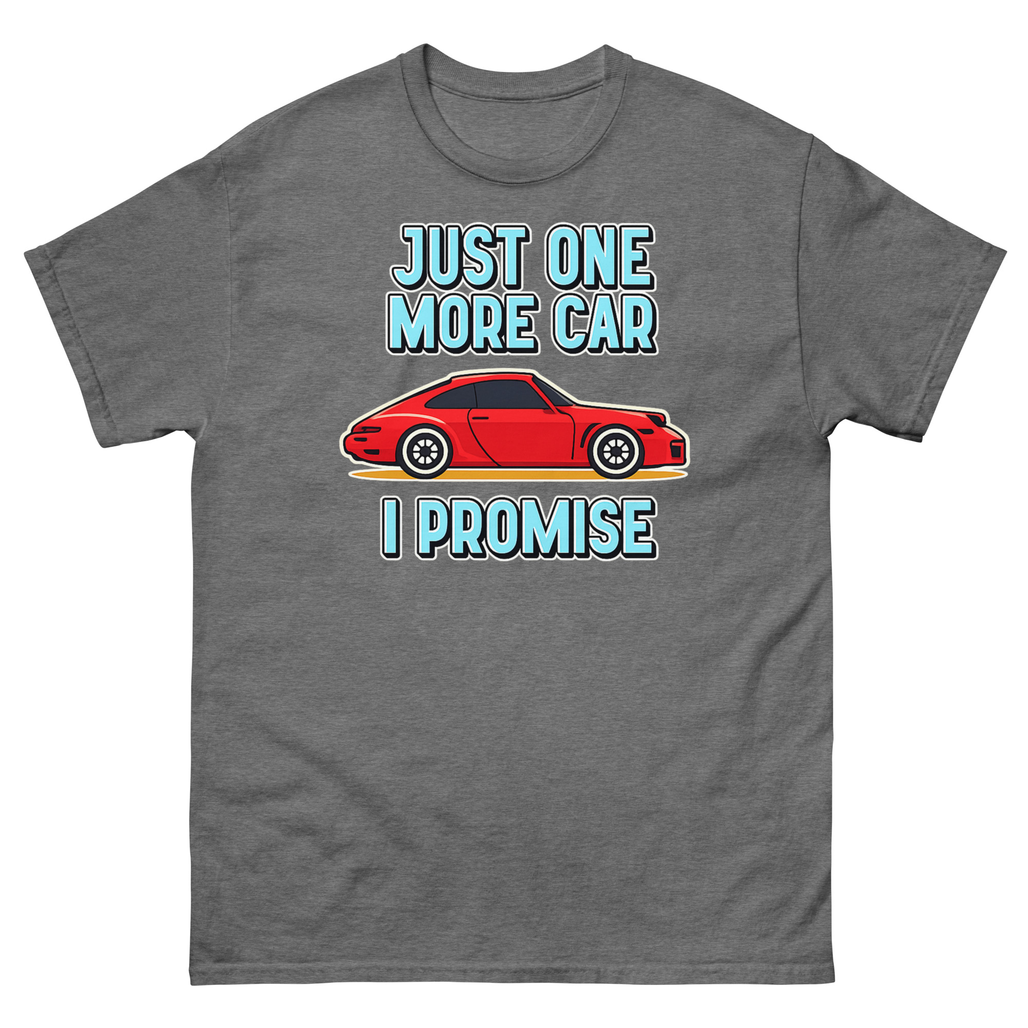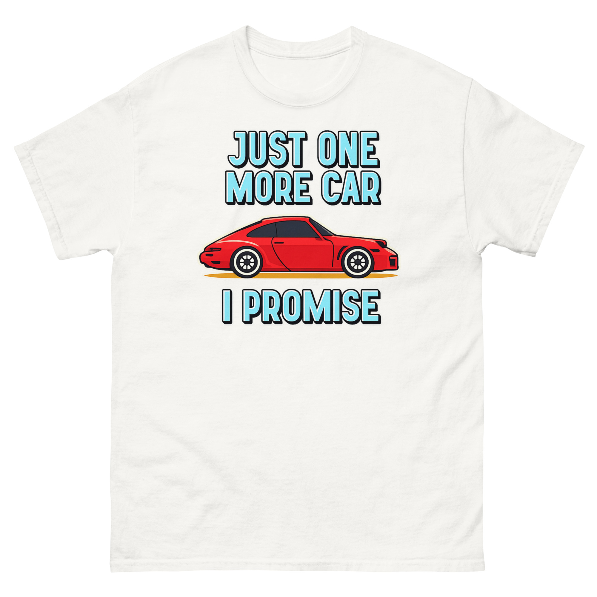 Let’s be honest: for some people, a garage never feels quite full. This Just One More Car I Promise T Shirt design comes directly from those endless conversations about the “next” car, the “dream” project, or the “final” purchase that somehow never is. The bold red cartoon sports car is that irresistible find, the one that makes you smile just thinking about it. Paired with the cheeky, chunky lettering of “JUST ONE MORE CAR I PROMISE,” it turns a common inside joke among gearheads into wearable art. It’s not just a graphic; it’s a nod to the passion that fuels weekend restorations, spontaneous bids at auctions, and the perpetual hunt for the next great ride. Whether you’re the husband with a driveway full of projects or the friend always planning for the next car club event, this tee gets it.