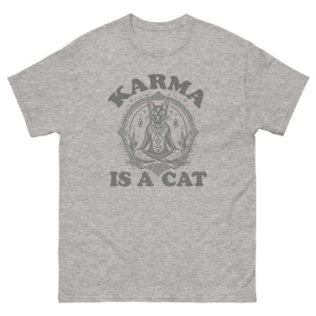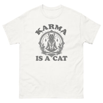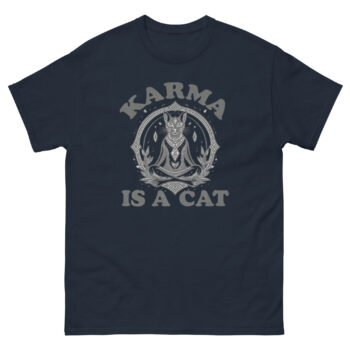 The inspiration for this karma themed shirt for cat lovers struck during a quiet, meditative moment or at least, as quiet as it gets with a cat around. We watched a cat sitting perfectly still, its eyes closed in a look of pure bliss, and the phrase “Karma is a Cat” suddenly made perfect sense.