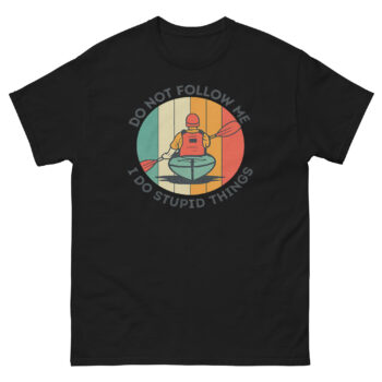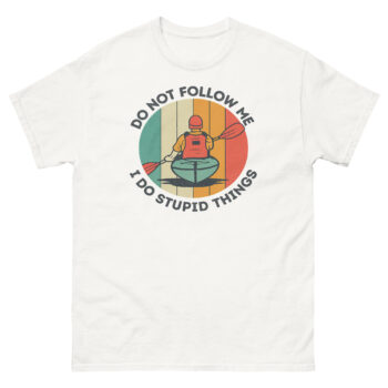 This “Do Not Follow Me, I Do Stupid Things” kayak t-shirt blends humor with outdoor adventure style. Featuring a retro kayaker design, it’s the perfect gift for paddlers and water sport enthusiasts who don’t take themselves too seriously.