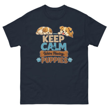 This is a charming graphic tee for announcing the exciting arrival of a new litter. The Keep Calm We’re Having Puppies T Shirt features a unique design with hand-drawn puppies and playful typography. It’s the perfect creative dog breeder announcement gift or new puppy reveal apparel for welcoming furry additions.