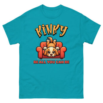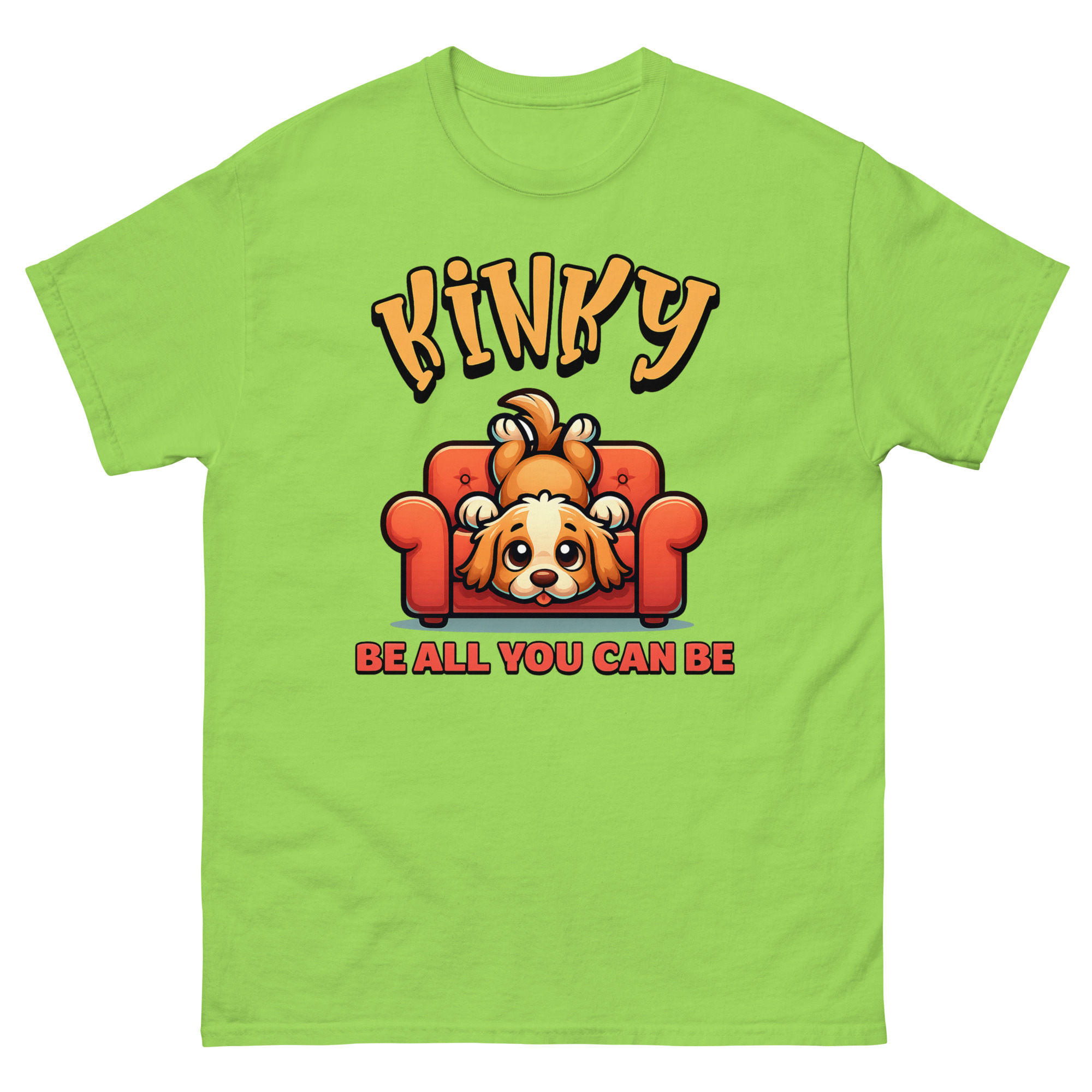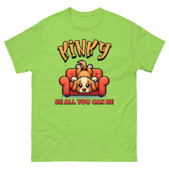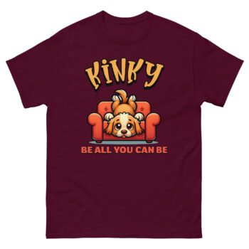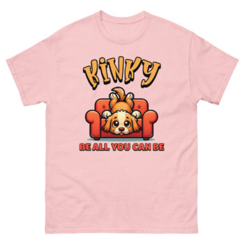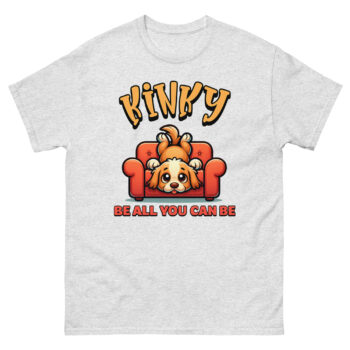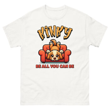 Have you ever seen a t-shirt that makes you do a double-take? First, you chuckle, then you think, and finally, you just get it. That’s the magic of our Kinky Be All You Can Be Shirt. At first glance, it’s a hilarious cute dog couch illustration t shirt. But look closer, and you’ll discover a celebration of playful self-expression. This isn’t just apparel; it’s a conversation starter for anyone who loves clever, cheeky humor. Let’s dive into why this playful dog slogan shirt is the perfect addition to your wardrobe.