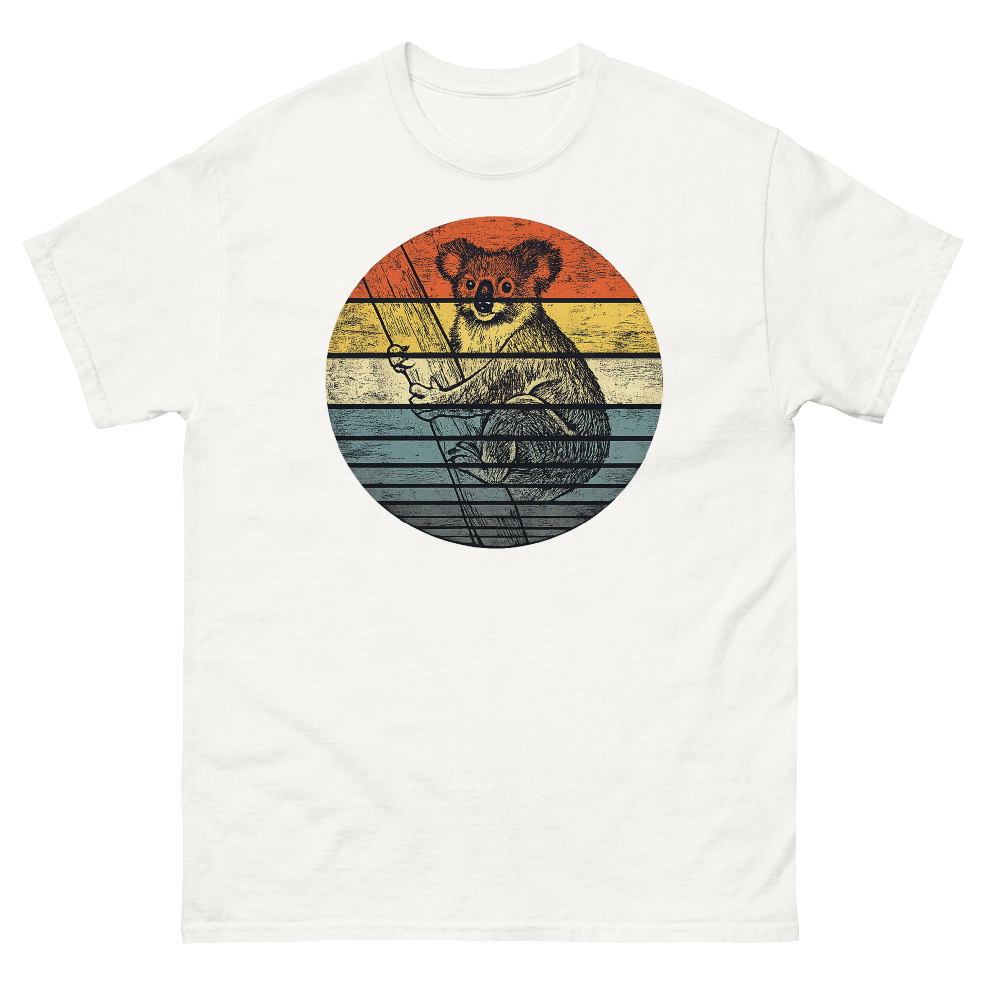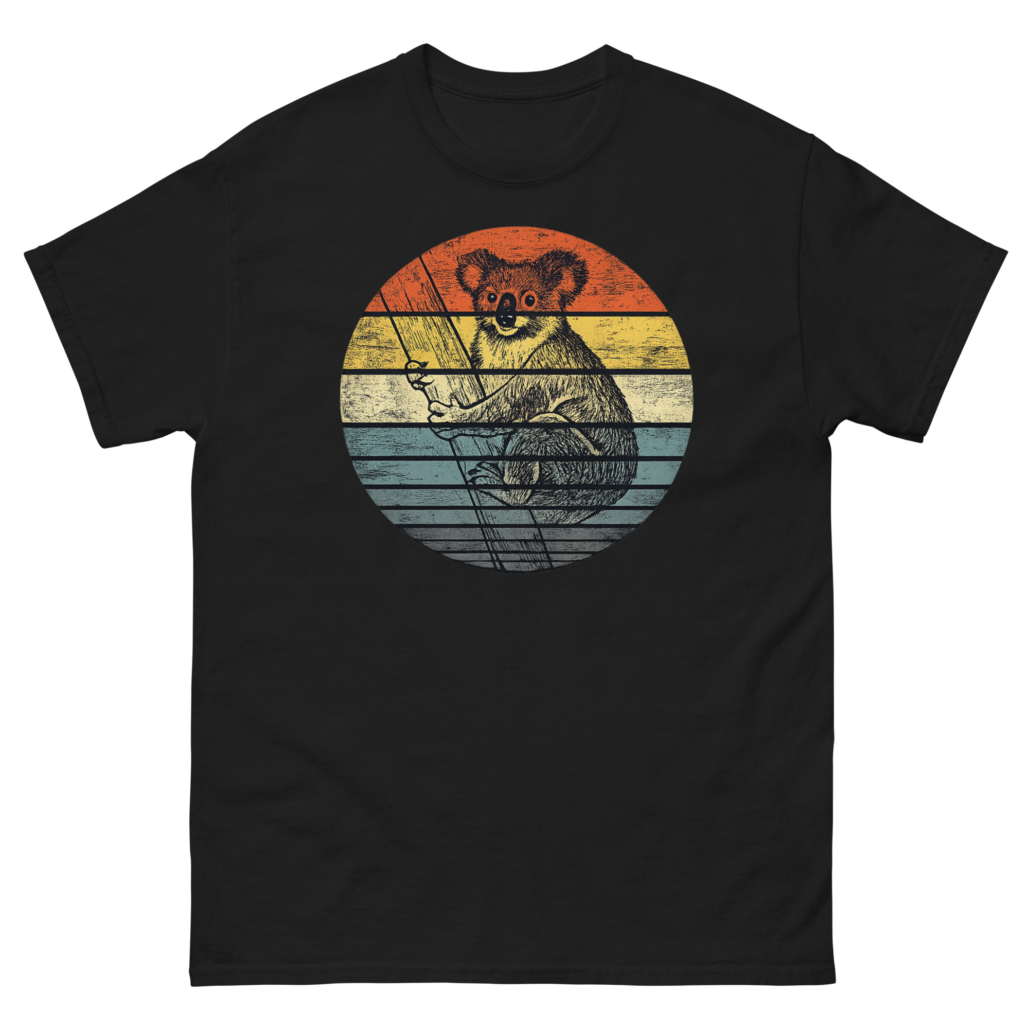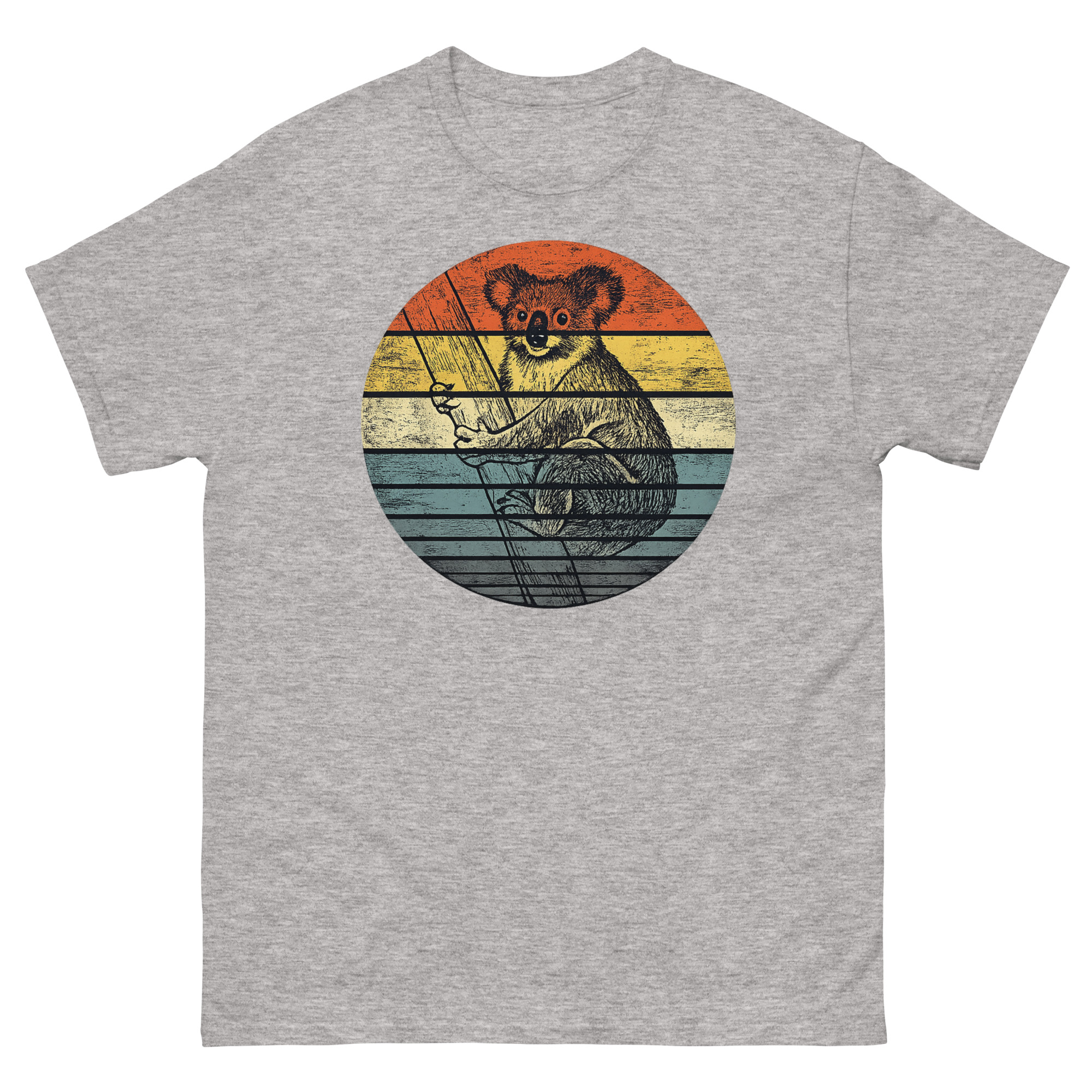 This soft cotton t-shirt features a detailed, hand-drawn koala resting inside a classic retro sunset circle. Our Koala Sunset T Shirts stands out because it pairs a realistic wildlife illustration with a vintage, worn-in aesthetic. It’s designed for animal lovers, vintage fashion fans, and anyone who enjoys unique, nature-inspired casual wear.
