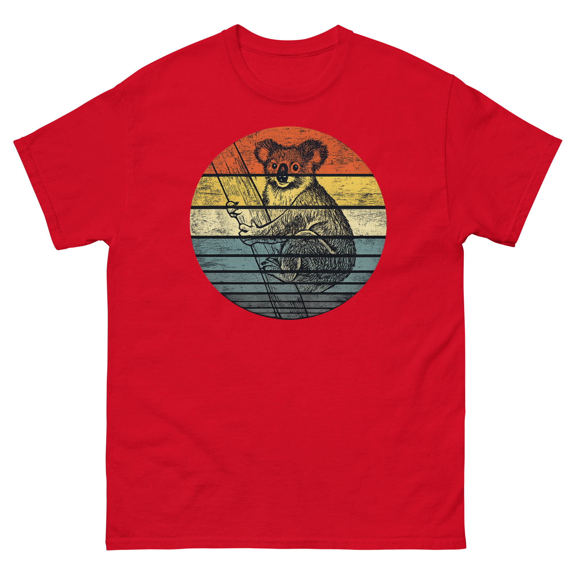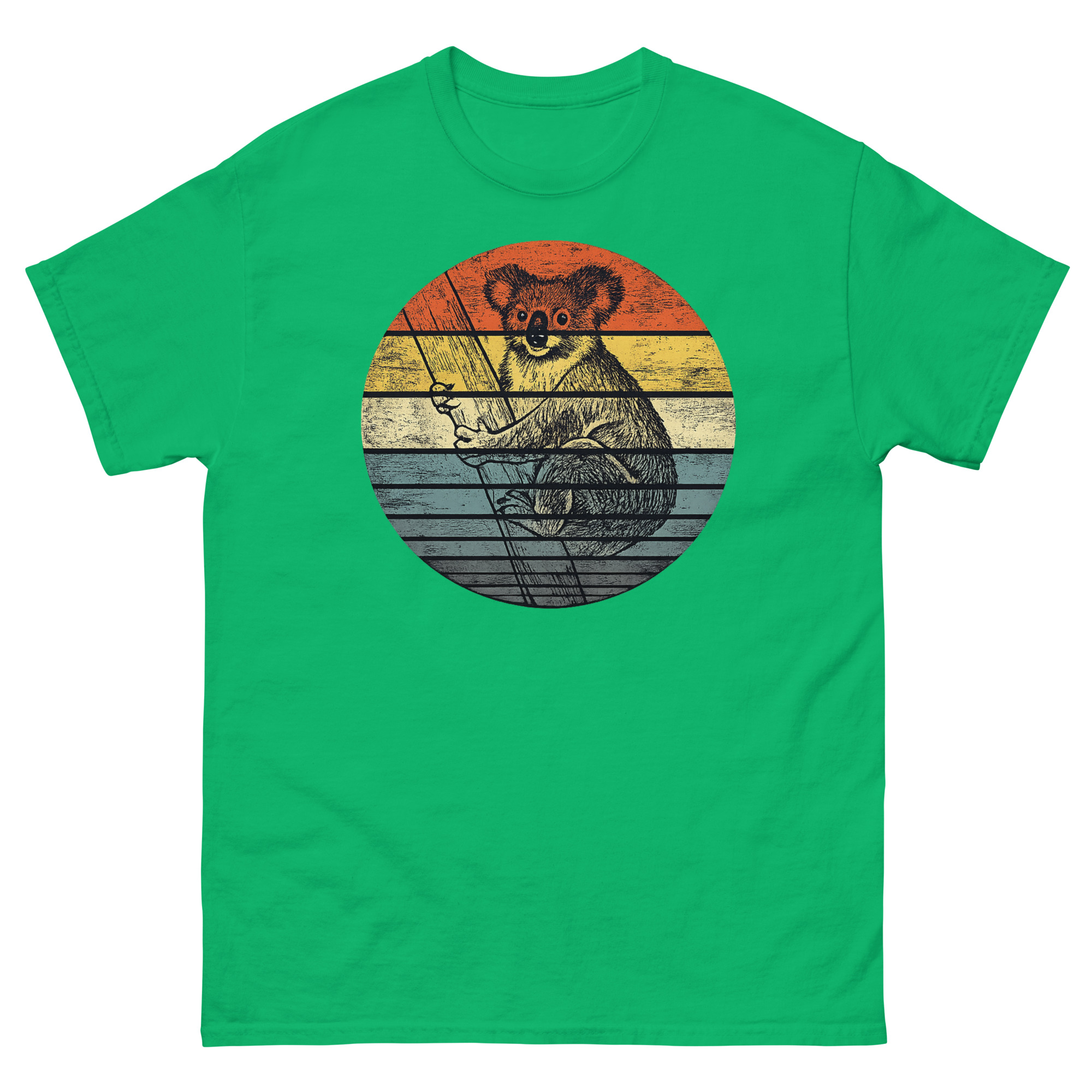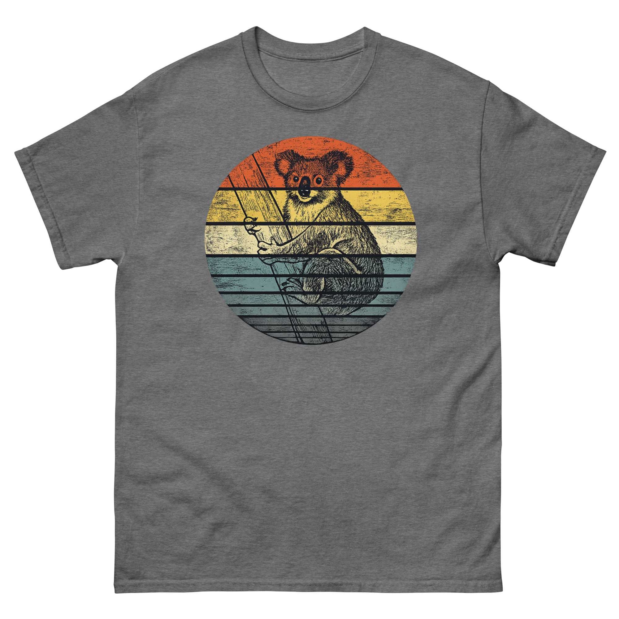 This soft cotton t-shirt features a detailed, hand-drawn koala resting inside a classic retro sunset circle. Our Koala Sunset T Shirts stands out because it pairs a realistic wildlife illustration with a vintage, worn-in aesthetic. It’s designed for animal lovers, vintage fashion fans, and anyone who enjoys unique, nature-inspired casual wear.
