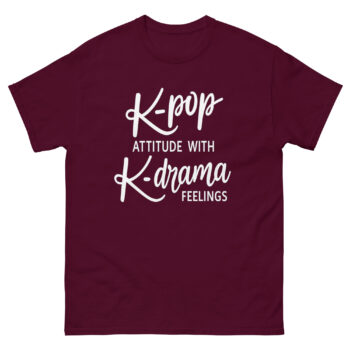 Firstly, let’s talk about the message. The design features the powerful phrase: “K-pop ATTITUDE WITH K-drama FEELINGS.” This clever typography isn’t random. For instance, the words “K-pop” and “K-drama” flow in a stylish cursive script, mirroring the artistry and flair of both industries. Conversely, “ATTITUDE” and “FEELINGS” are bold and strong, making a statement you can feel.