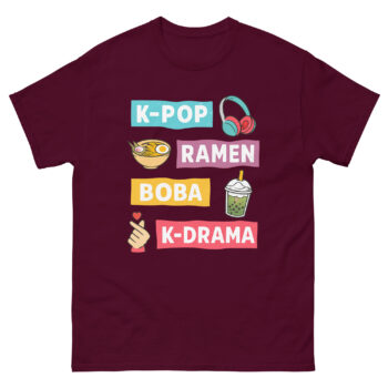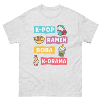 The ultimate fan essentials: K-Pop, ramen, boba, and K-Drama. This shirt celebrates everything you love about Korean culture in one design.