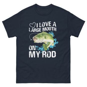 If you’re serious about bass fishing—and not so serious about your humor—this is your shirt. Featuring a large green bass and the bold phrase “I Love a Large Mouth on My Rod,” this tee is designed to hook laughs at the lake, dock, or party. A top pick for adult anglers who love a bit of rod-related wordplay.