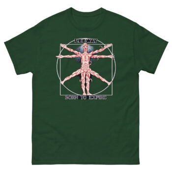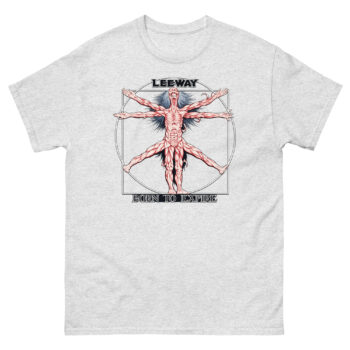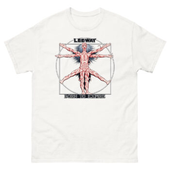 It takes Leonardo da Vinci’s classical symbol of human perfection and proportion, the Vitruvian Man and violently reimagines it for the streets of 1980s New York. The figure is skinless, muscular, and screaming, with wild blue hair and multiple limbs outstretched. This isn’t about ideal beauty; it’s about exposed reality, mortality, and the gritty “crossover ethos” that defined the scene. The stark typography, “LEEWAY” in chrome and “BORN TO EXPIRE” in serif, completes this iconic piece of album art. Wearing this Leeway band Vitruvian man tee is a direct nod to that revolutionary moment in 1989.