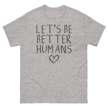 The shirt features the phrase “LET’S BE BETTER HUMANS” in bold, hand-drawn black lettering across a soft gray background. The font feels personal, like a handwritten note from a friend. Beneath the text, a small heart symbol adds warmth and sincerity, reinforcing the message of compassion.