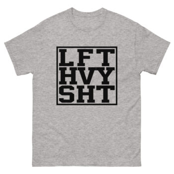 Minimalist in design but loud in attitude, the “LFT HVY SHT” gym t-shirt is for serious lifters who believe in strength over talk. Featuring a bold block-letter print in black on a heather gray shirt, this design keeps your message short, strong, and to the point.