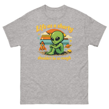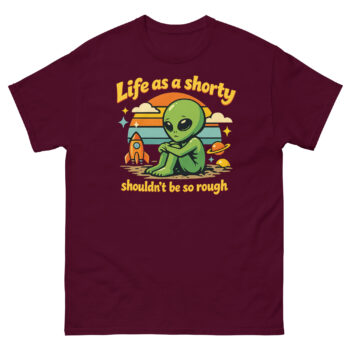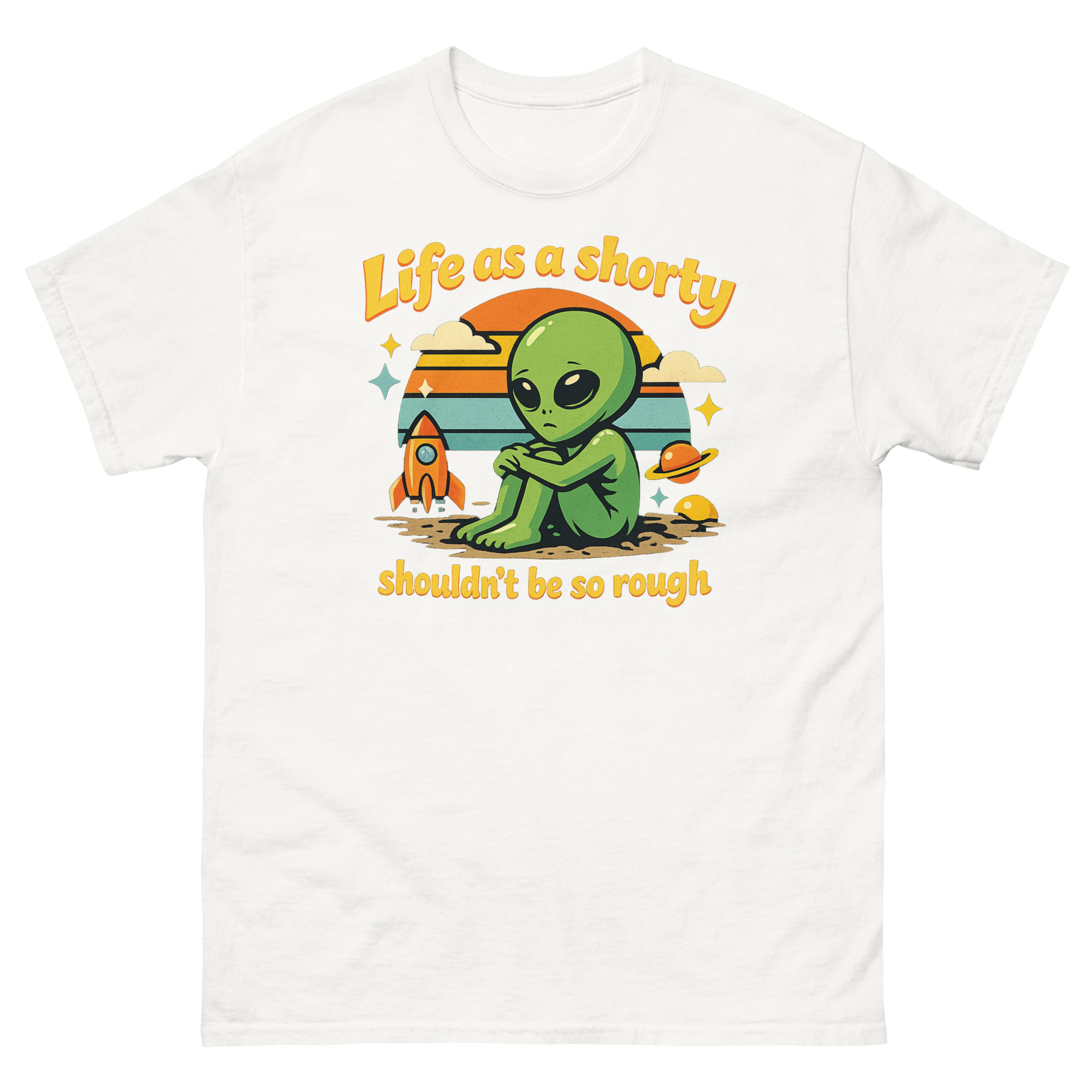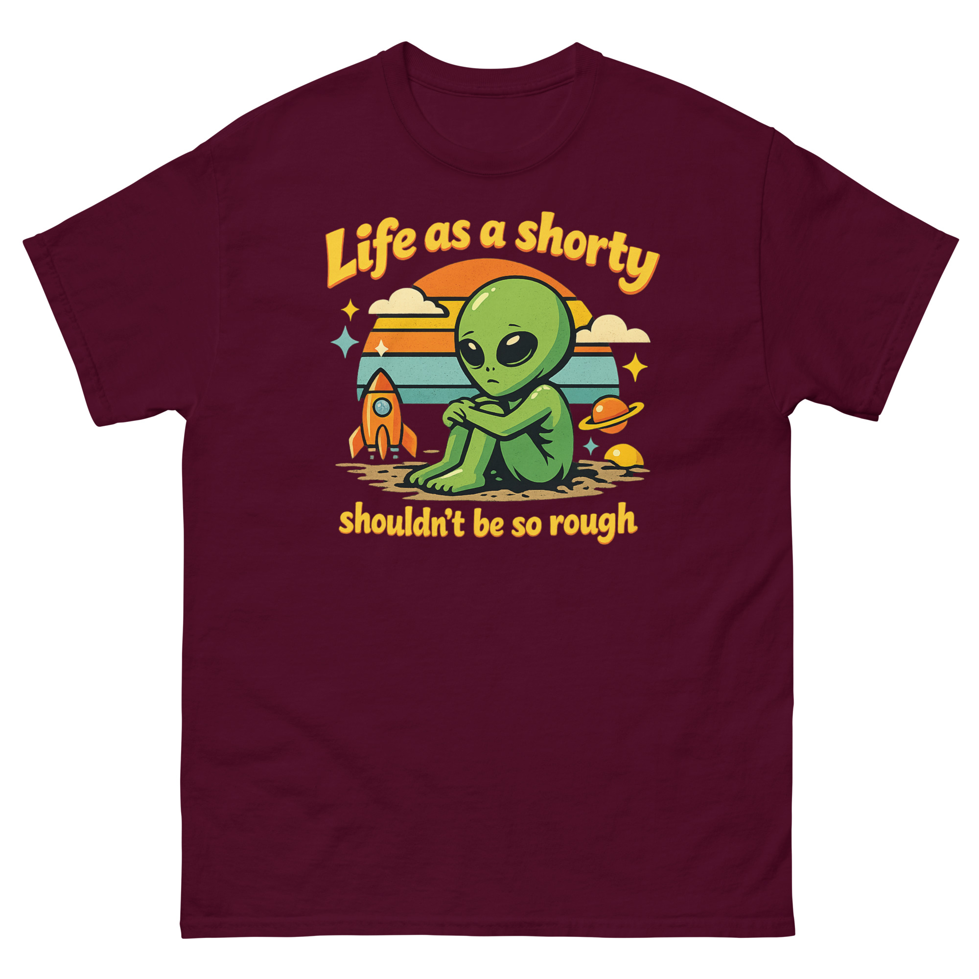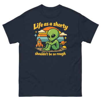 The iconic words “Life as a shorty” curve over the sunset, while “shouldn’t be so rough” anchors the scene below. The genius here is the double meaning. It honors Inspectah Deck’s raw lyric while reclaiming “shorty” for the short kings, the petite, and anyone feeling literally or figuratively small. This funny sad alien t-shirt turns struggle into sympathetic, nostalgic art.