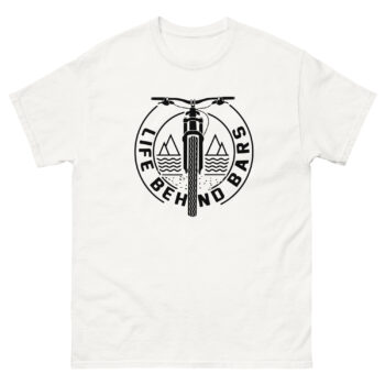 The centerpiece? A rugged bike handlebar with a front tire—symbolizing the “life behind bars” every rider knows too well. Wrapped around a mountain and trail backdrop, the text completes the cyclist quote t-shirt vibe. It’s not just apparel; it’s a badge of honor for those who thrive on off-road and trail rides.