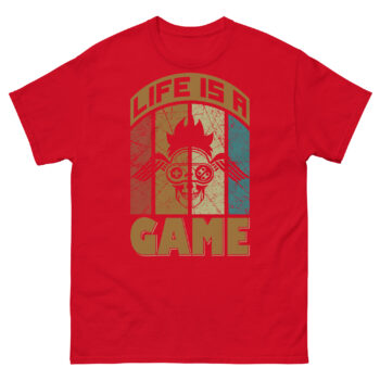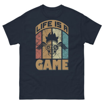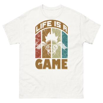 Retro-style gamer t-shirt featuring the motivational quote “Life Is A Game” with an illustrated gamer character wearing controller glasses. A perfect gift for video game fans and gaming lovers.