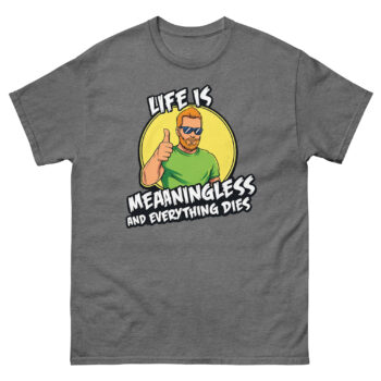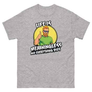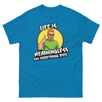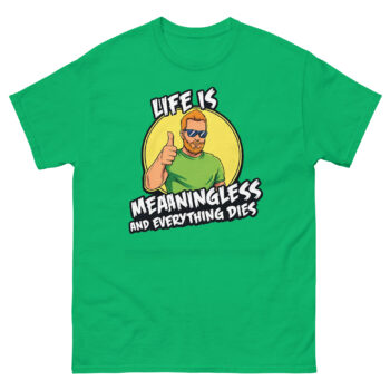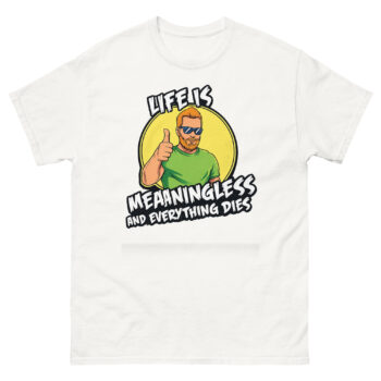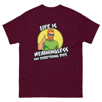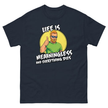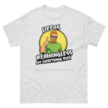 Ready to wear your perspective with a smirk? The Life is Meaningless and Everything Dies shirt is more than just apparel; it’s a comfortable, well-made statement for the pragmatically humorous. Choose your perfect fit from our full size range and experience the quality of our vibrant, responsible print. Don’t overthink it, grab your Life is Meaningless and Everything Dies shirt now and greet the absurdity with a thumbs up.