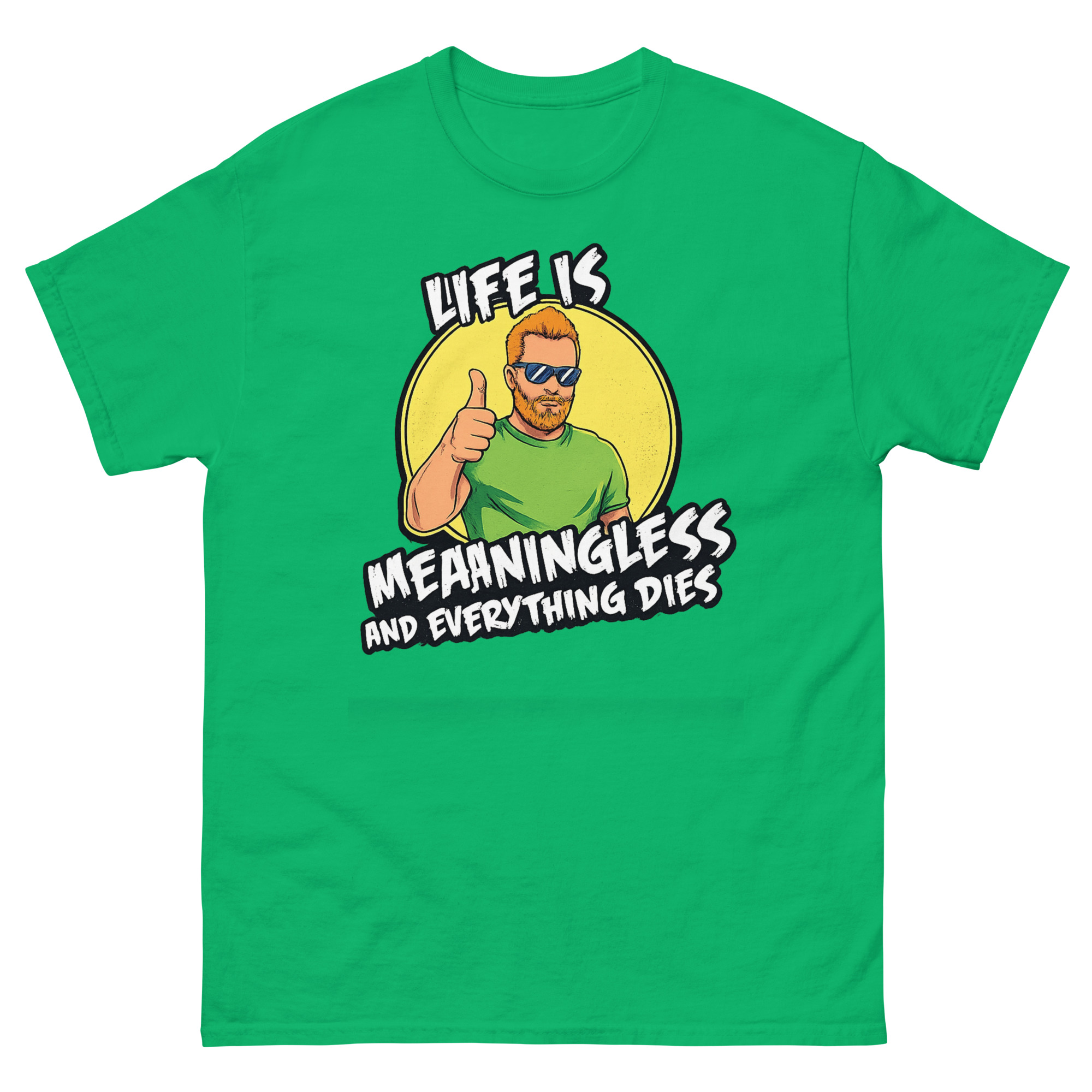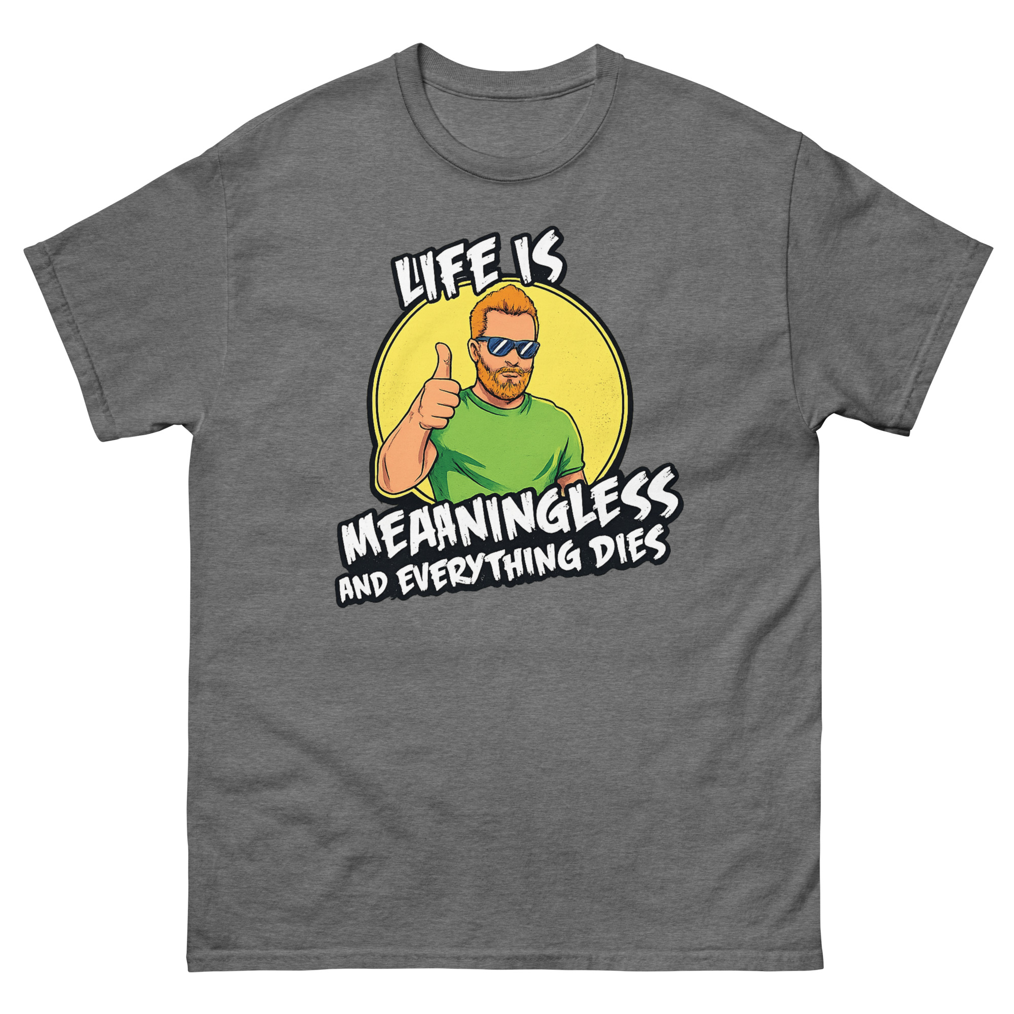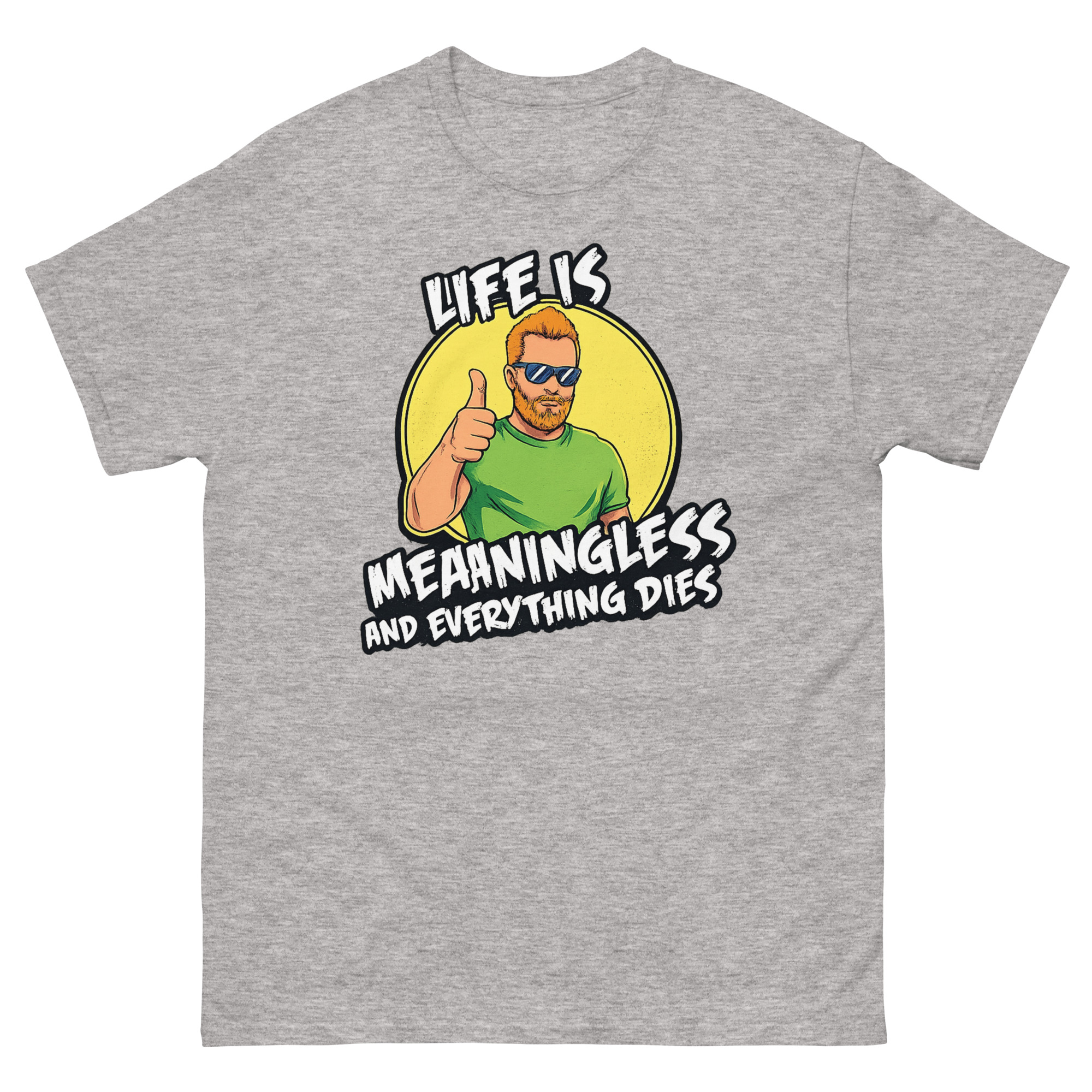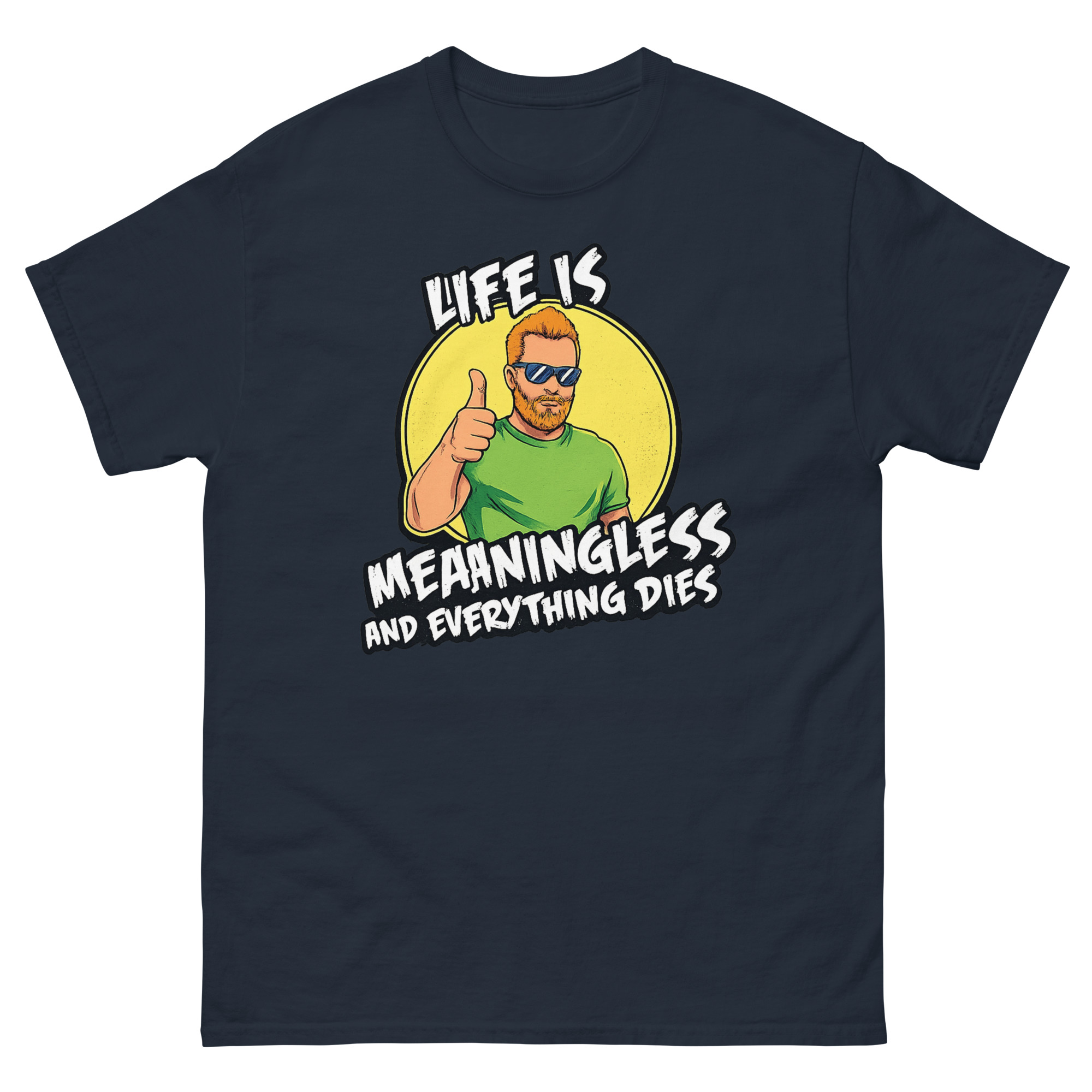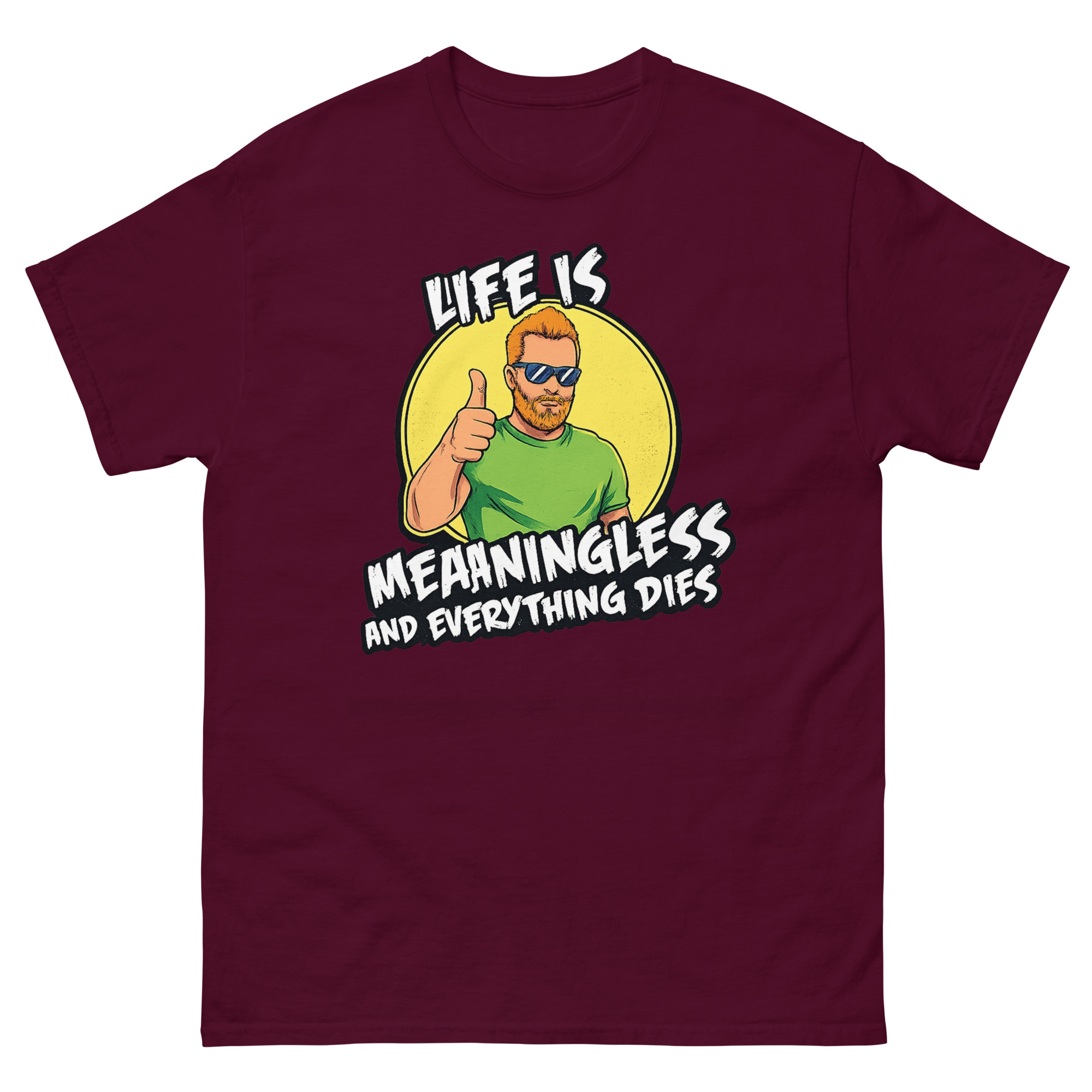 The graphic is intentionally clear and contradictory. Centered on the shirt, you’ll see a cheerful “Cool Guy” character with ginger hair, a beard, sunglasses, and a big thumbs up, standing in front of a bright yellow sun. However, the text overlaid on this happy scene delivers the blunt message: “LIFE IS MEANINGLESS AND EVERYTHING DIES” in a rough, grunge-style font.