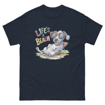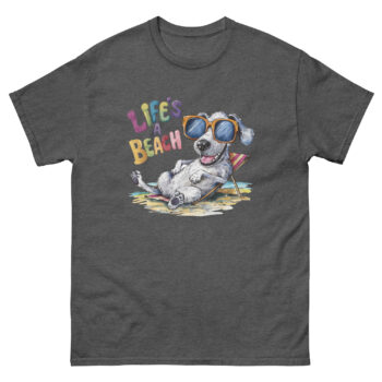 Picture this: a lazy afternoon, ocean waves crashing, and your pup sprawled out like they own the shoreline. That’s the exact vibe this “Life’s a Beach” relaxed dog beach tee captures perfectly. Featuring a chill cartoon dog in oversized orange shades lounging on a beach chair, this summer dog lover graphic tee isn’t just apparel—it’s a mood.