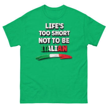 This is the Life’s Too Short Not To Be Italian shirt, a bold, comfortable cotton tee that proudly displays your heritage with a vibrant tricolore flag design. What makes this shirt unique is its high-quality, long-lasting print created with eco-safe inks, ensuring the statement remains crisp. Ultimately, it’s designed for anyone with Italian roots, family pride, or a deep love for Mediterranean culture, from a proud Italian American to someone shopping for a perfect heritage gift.