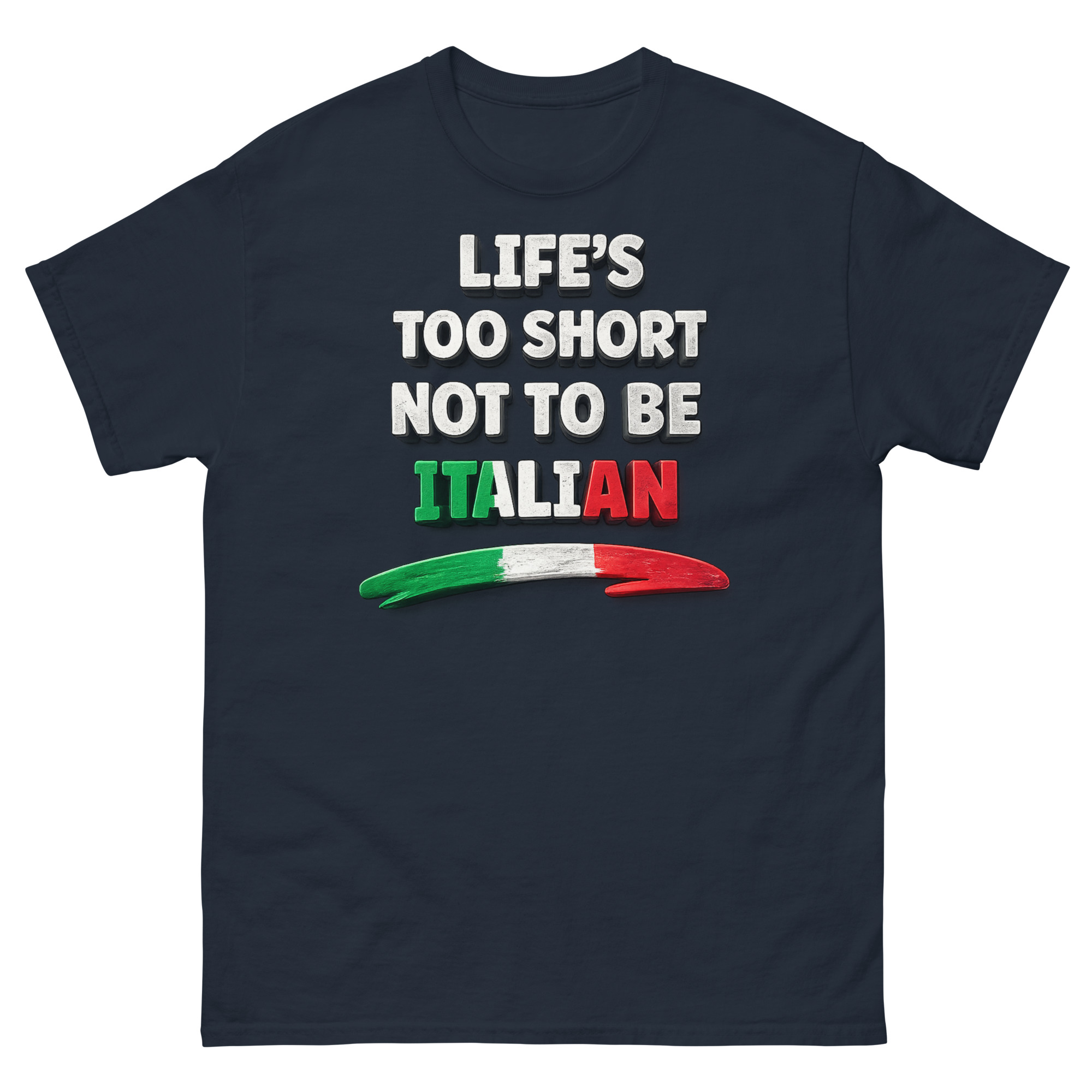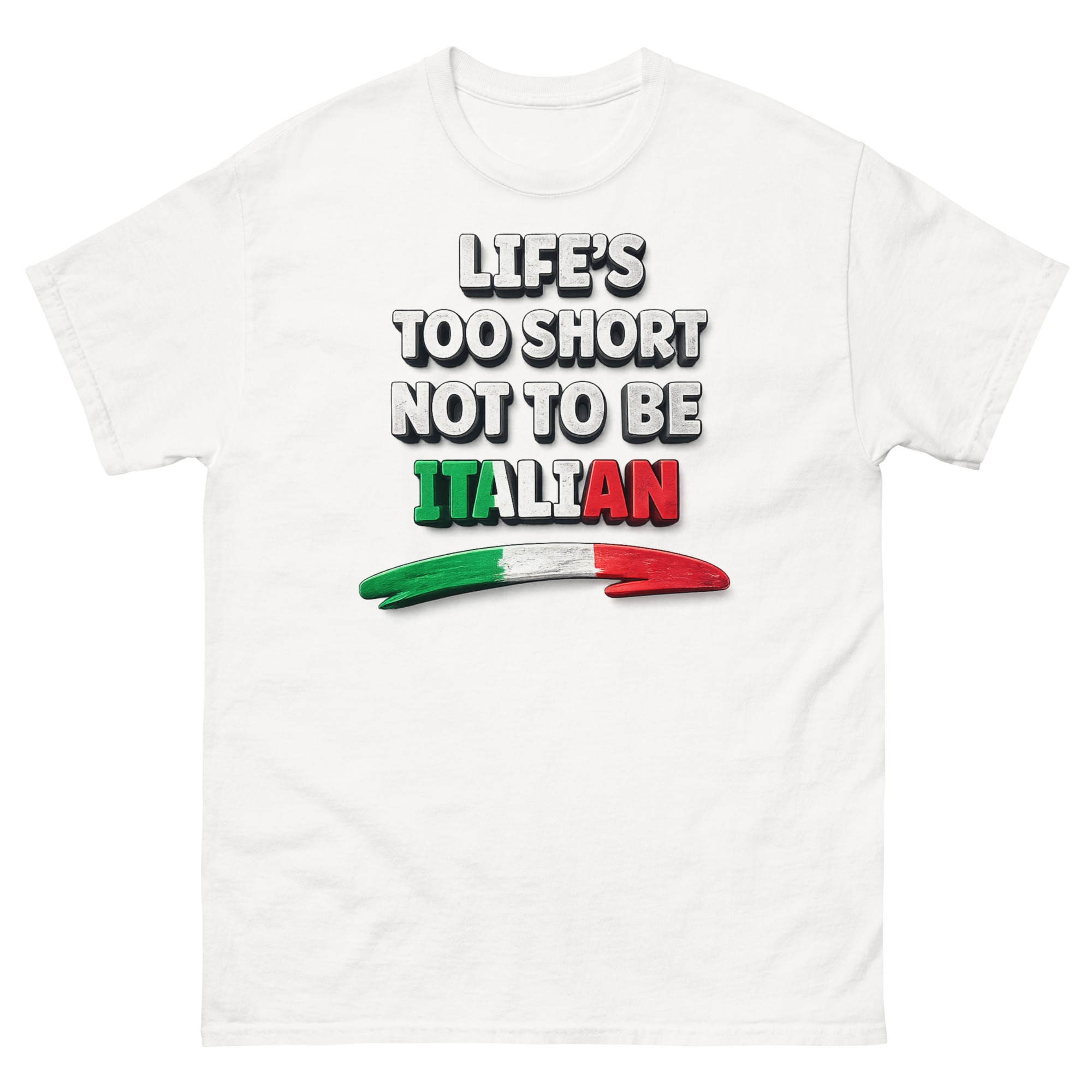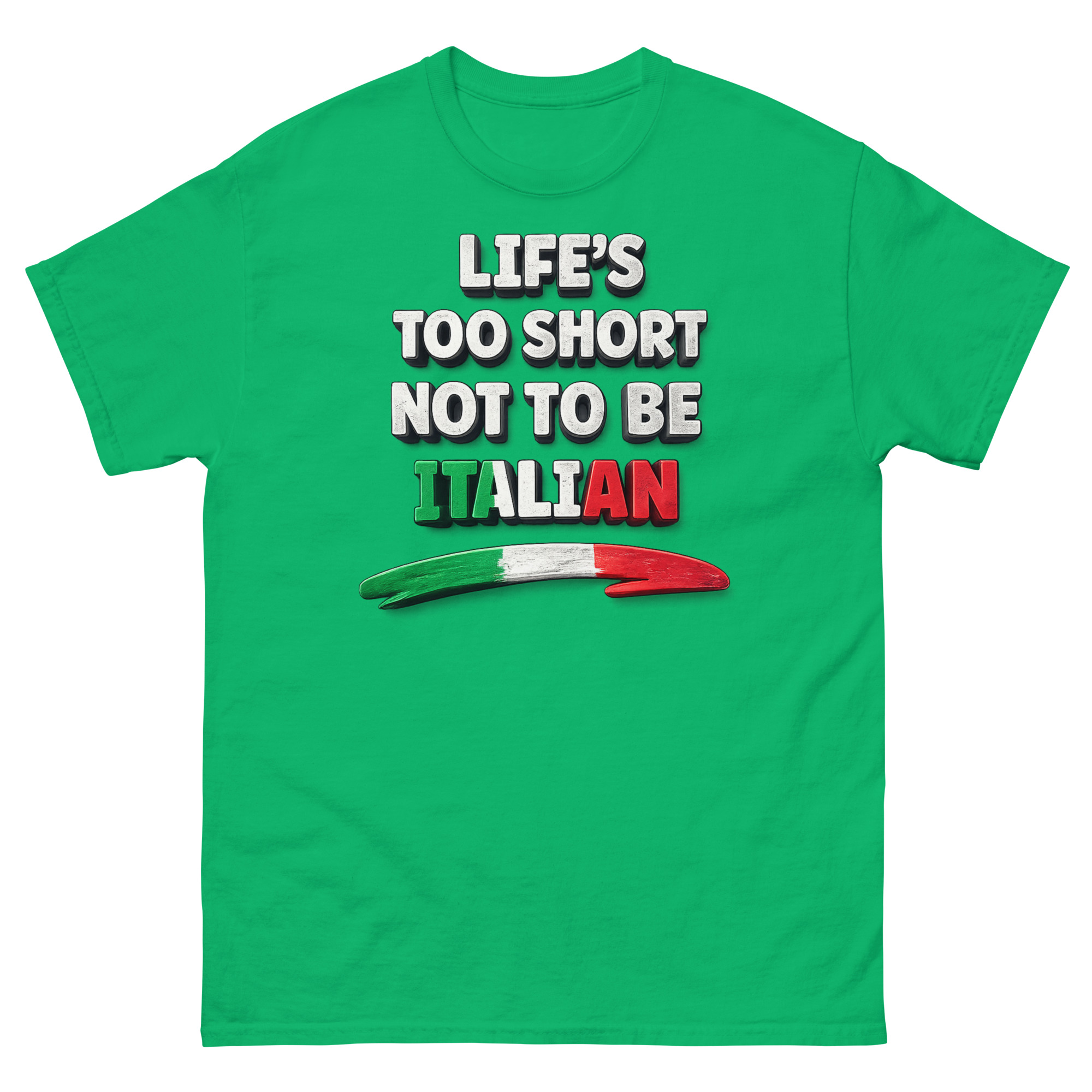 The graphic is intentionally clear and impactful. Centered on the chest, the phrase “LIFE’S TOO SHORT NOT TO BE” is printed in a bold, distressed white font. The final word, “ITALIAN,” however, steals the show in brilliant green, white, and red blocks of color. Below the text, an artistic brushstroke in the same tricolore palette adds a dynamic, painterly flair.