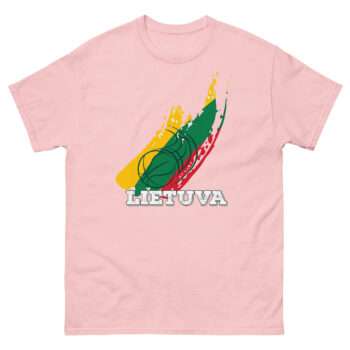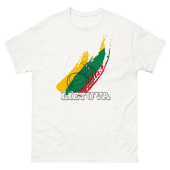 Our designer, inspired by the raw energy of a FIBA tournament crowd, picked up a brush. The three bold, brushstroke waves yellow, green, red came first, symbolizing the dynamic flow of the game and our unwavering Trispalvė pride. Then came the magic touch: the subtle outline of basketballs, rolling through the paint as if the very essence of the sport is woven into our national colors. Finally, the weathered, distressed typography of “LIETUVA” stamps the design with resilience, echoing the grit of our National Team.