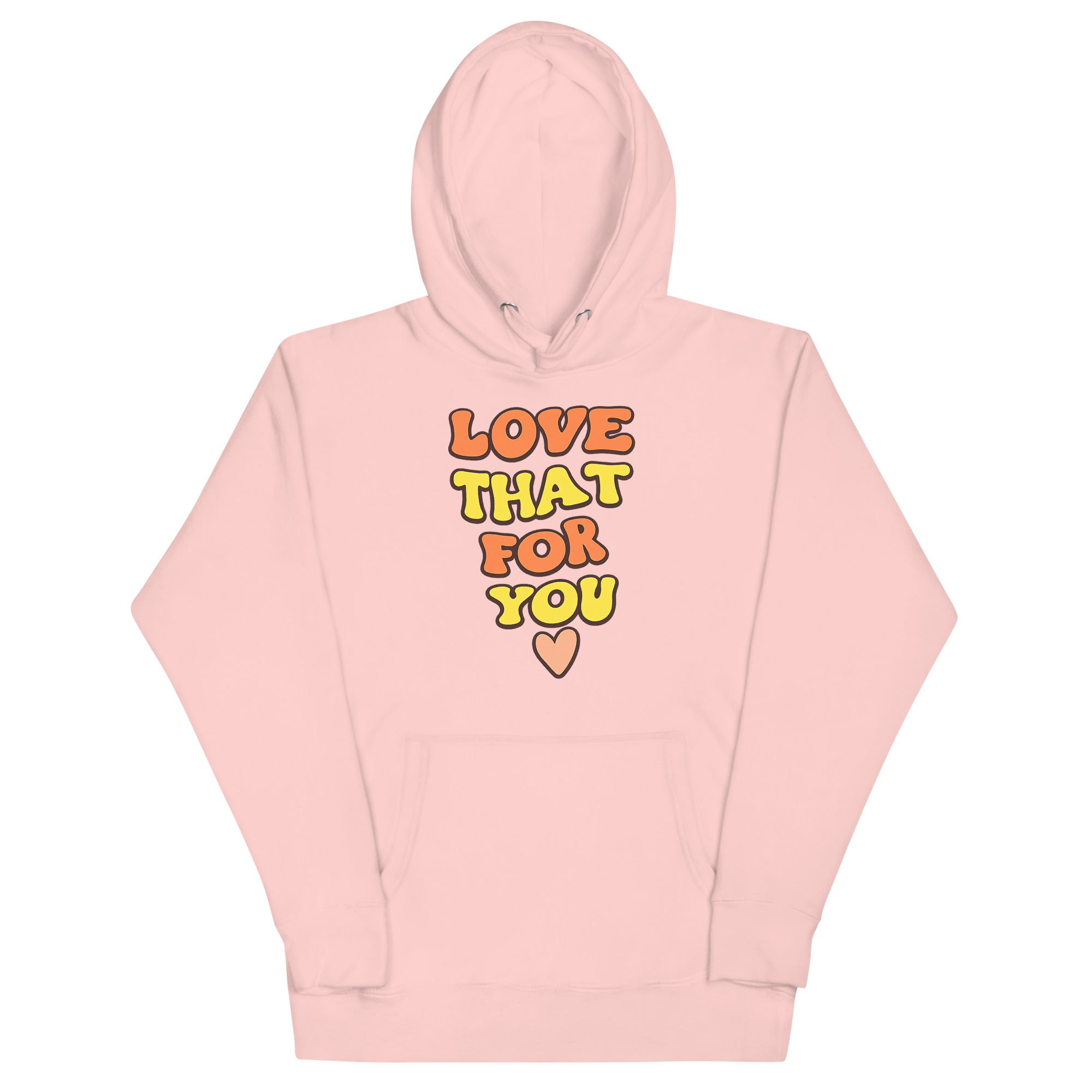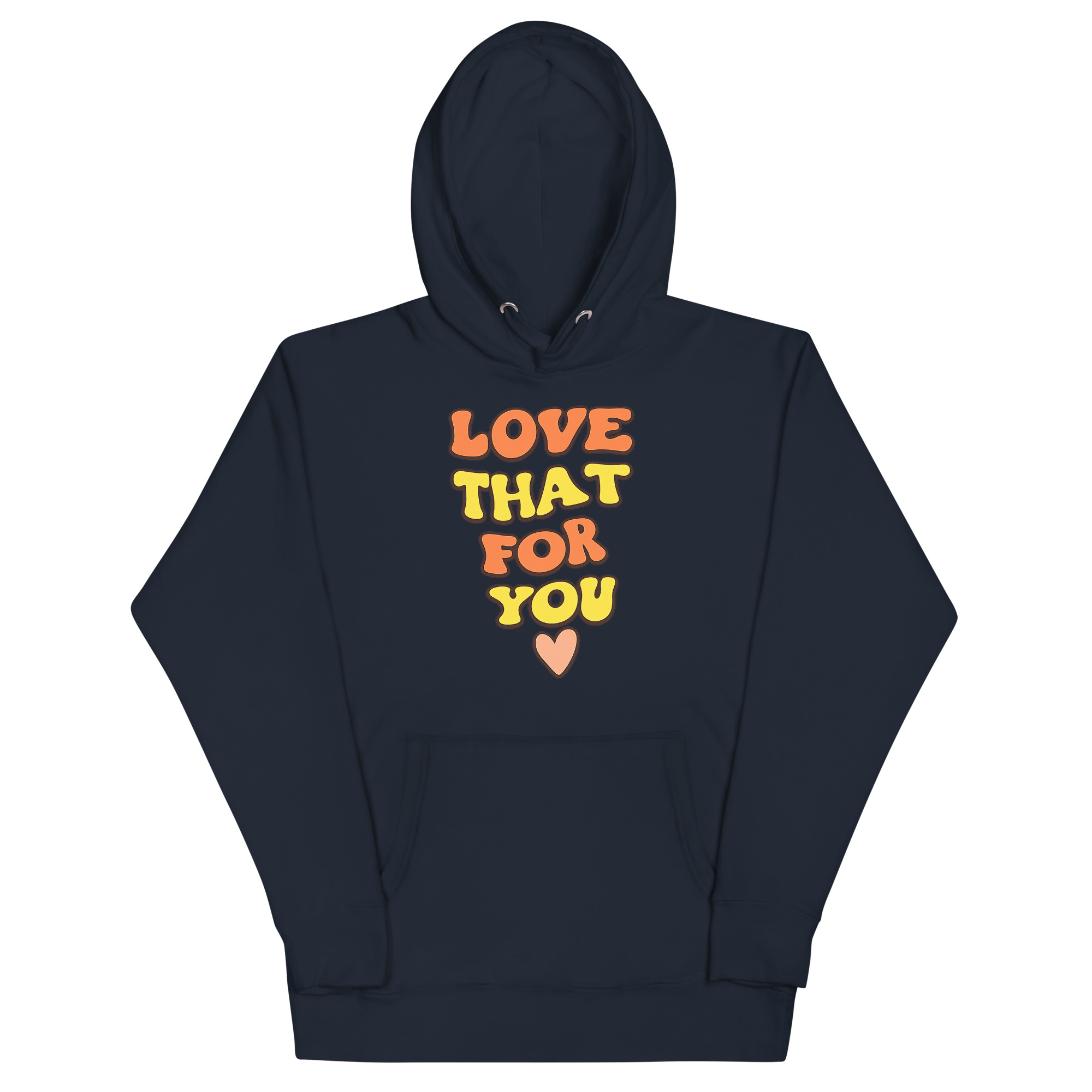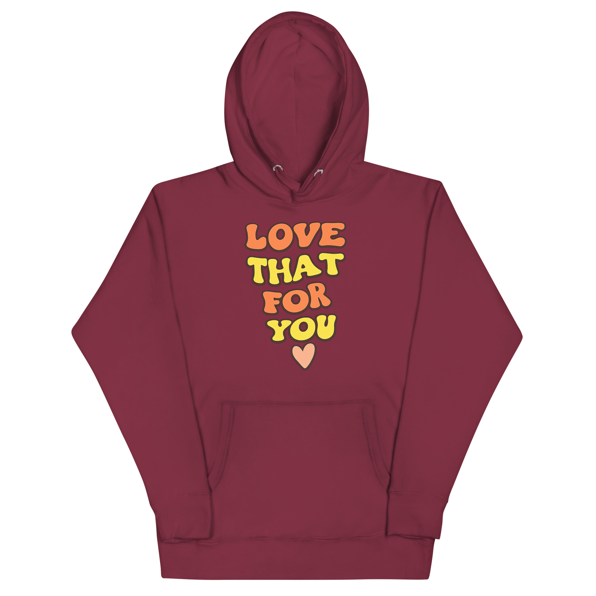 This Love That For You Hoodie was inspired by the everyday phrase “Love that for you,” often used to celebrate someone’s win, vibe, or style. The design team wanted to turn that affirmation into wearable art. By stacking the words in a pyramid shape and adding a soft heart graphic, they created a look that’s both cheerful and modern. Whether you’re heading to class, lounging at home, or grabbing coffee with friends, this hoodie lets you show support and positivity, without saying a word.