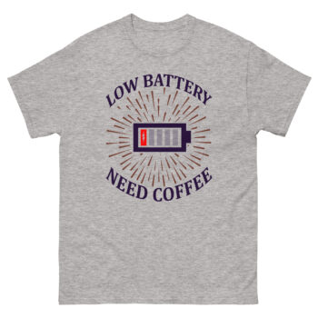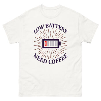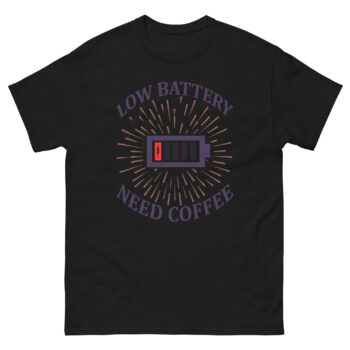 Feeling drained before noon? You’re not alone. This “Low Battery Need Coffee” t-shirt combines digital life with caffeine obsession, featuring a red low battery icon and energizing text to show what really powers you: coffee.