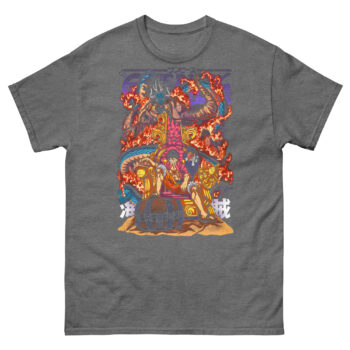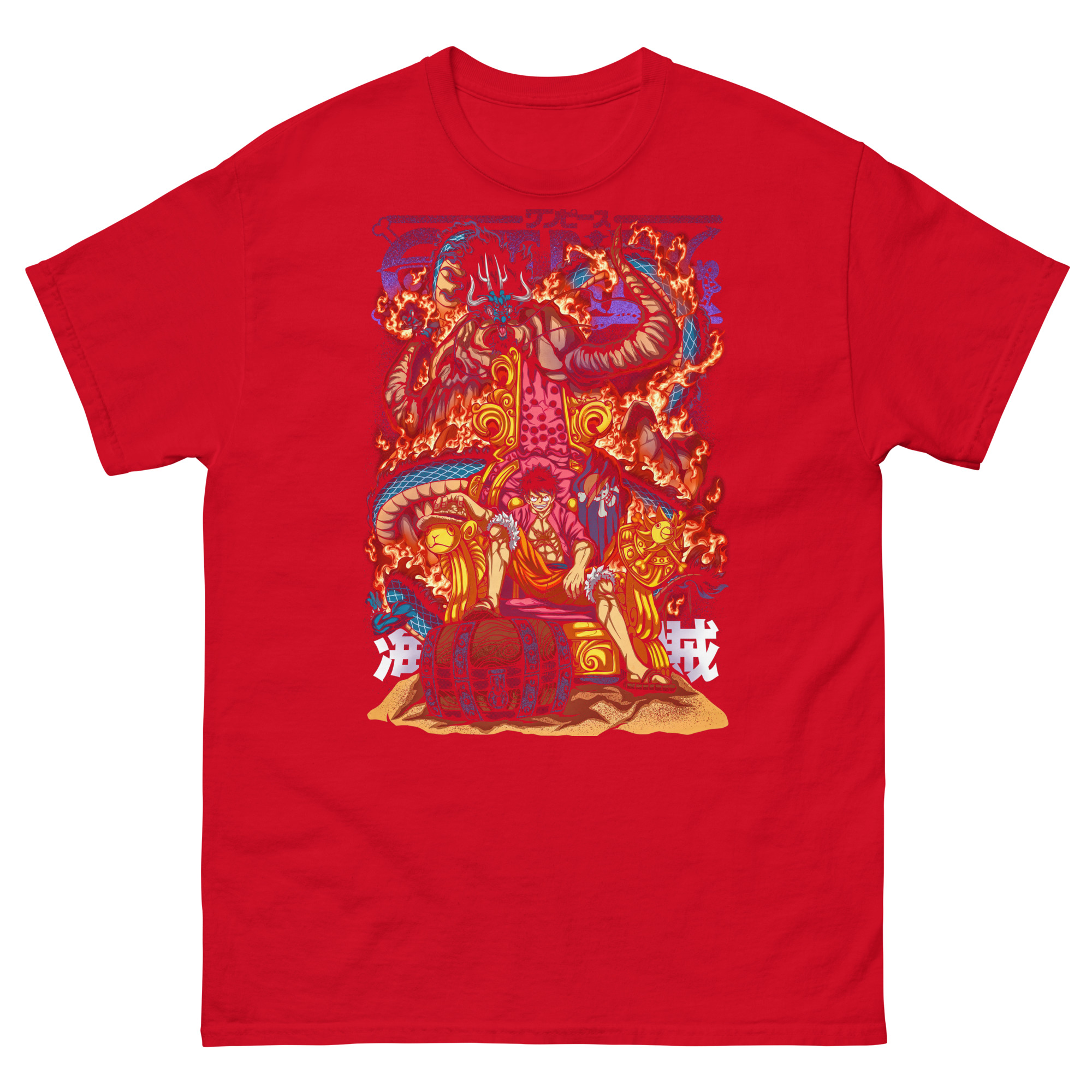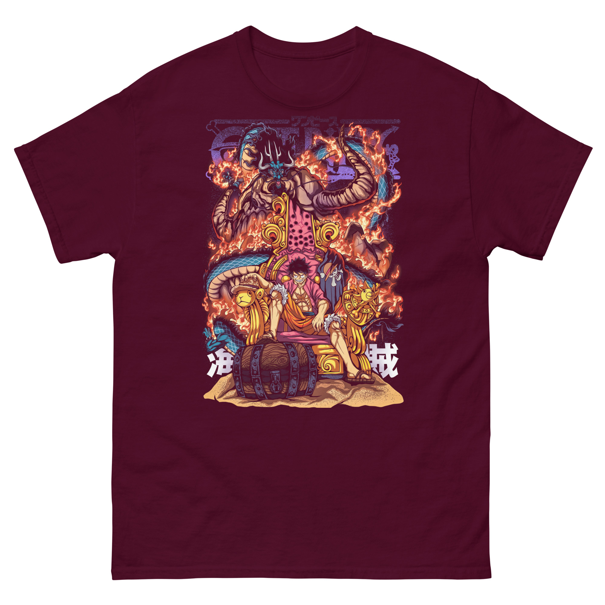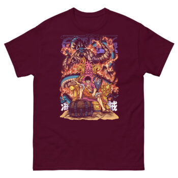 Let’s dive into the drama unfolding on this incredible pirate warrior graphic shirt. At first glance, you see Luffy, not standing, but sitting confidently on a throne. This is a powerful statement. He isn’t claiming the throne to rule over others. Instead, he’s challenging the very concept of power.