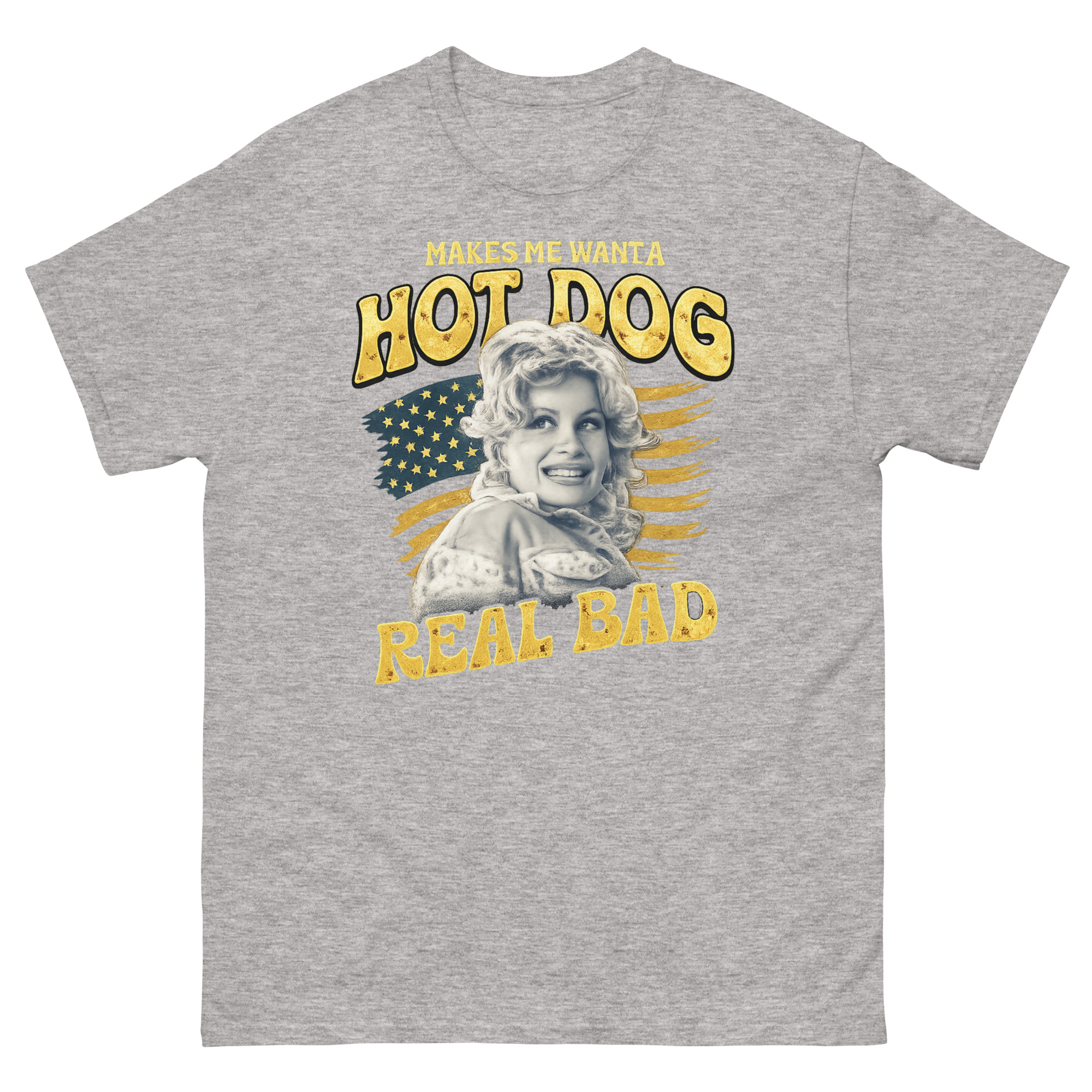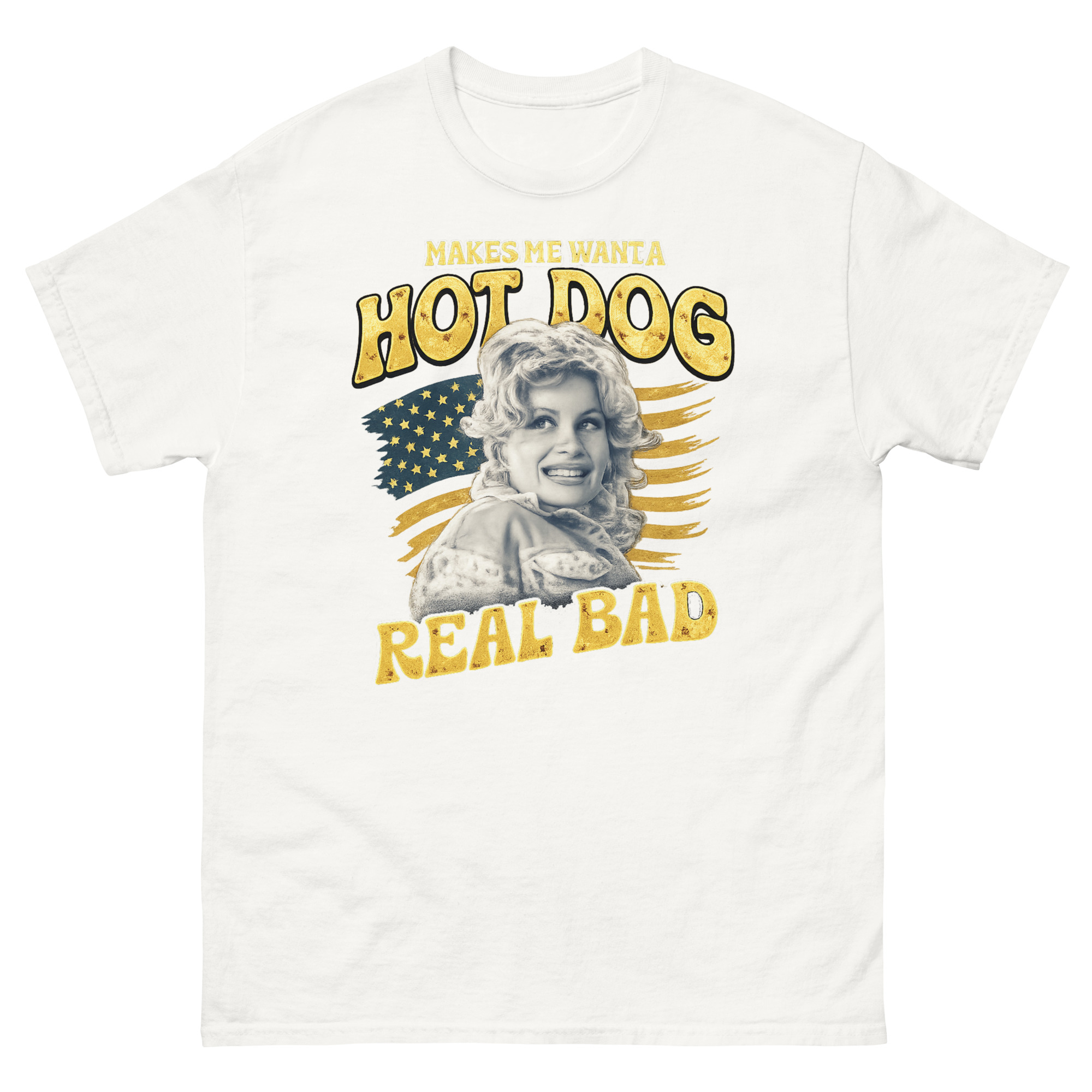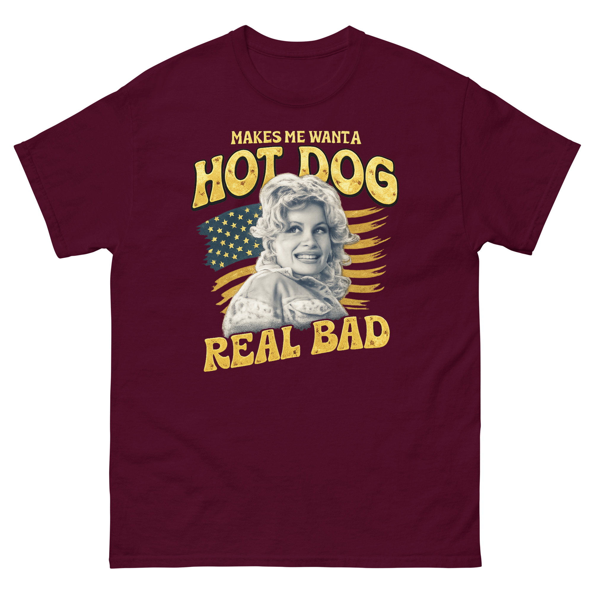 This Makes Me Want a Hot Dog Real Bad shirt is a humorous graphic tee that blends retro pin-up art with a classic American flag backdrop. It stands out with its cheeky, quote-based humor and authentic distressed print style. Perfect for fans of vintage country music legends, summer barbecues, or anyone who loves a funny, patriotic statement.
