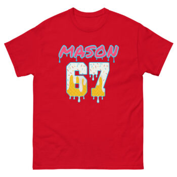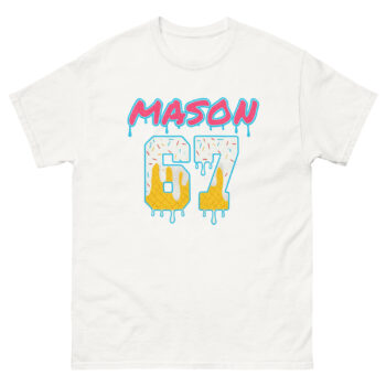First, you see “MASON” in huge, dripping bubble letters. It feels like a vintage sports logo, but the hot pink and neon blue colors are pure digital chaos. Then, your eyes drop to the number “67,” which isn’t just a number—it’s a melting waffle cone with sprinkles! This design doesn’t explain the joke; it is the joke. It’s the perfect trending internet joke shirt for men and women who appreciate irony and surreal humor.