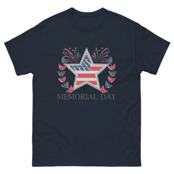Celebrate Memorial Day in style with this patriotic star t-shirt featuring the U.S. flag, fireworks, and laurel leaves. Bold tribute design.
