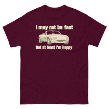 Pushing a lightweight, responsive roadster to its happy limit on a winding road is a feeling every Miata enthusiast understands. It’s not a drag race; it’s a dance. Consequently, our design features a clean, retro-style MX-5 illustration that oozes charm, not intimidation. The message, “I may not be fast, but at least I’m happy,” isn’t an apology. Instead, it’s a confident declaration of a smarter, more joyful approach to driving. This funny Miata driver t-shirt is for those in on the secret.
