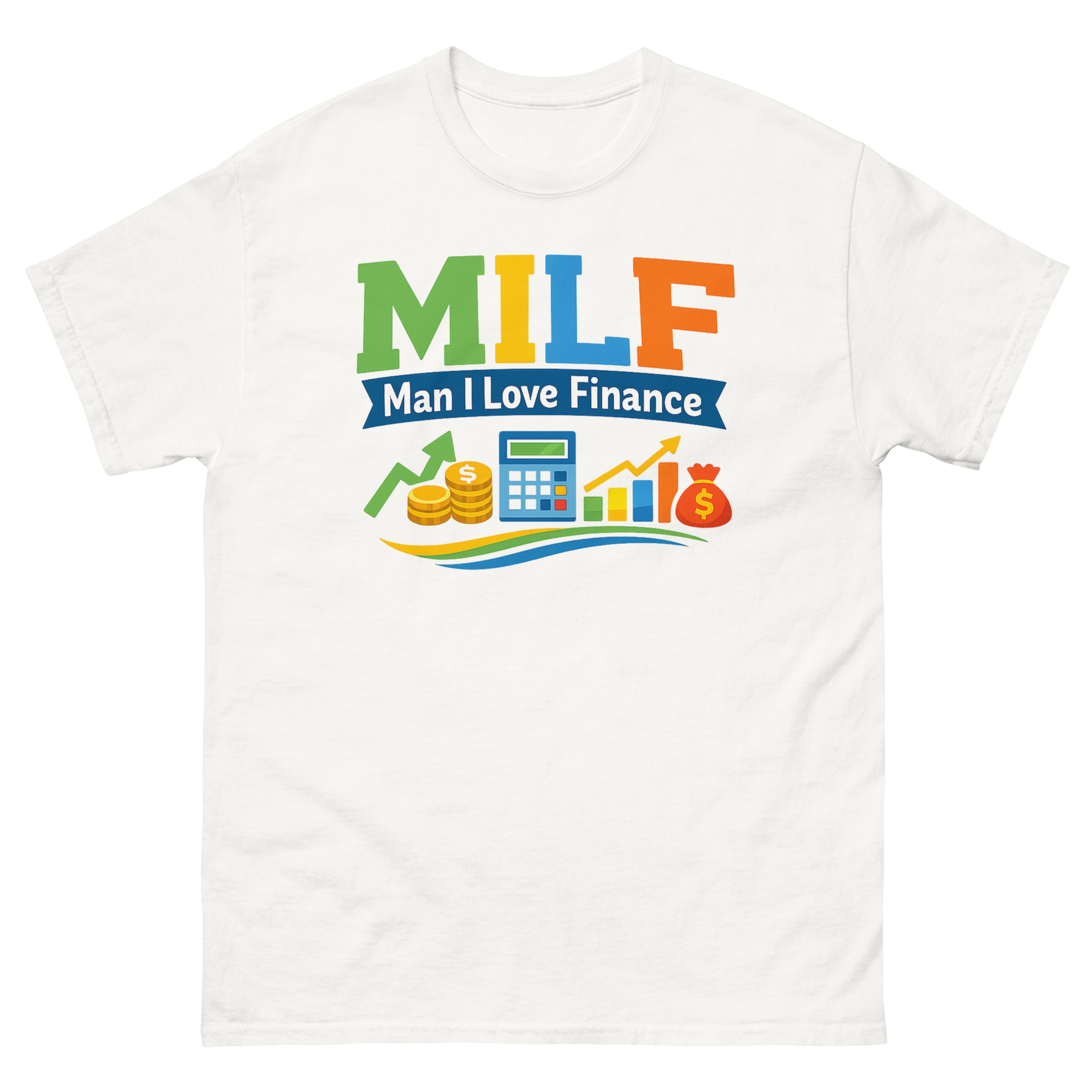 Instead of a boring monochrome logo, we used a high-energy “sticker-book” aesthetic. The massive, multi-colored “MILF” letters grab attention, while the calculator, bar chart, coins, and bullish arrow clearly communicate the finance theme. This vibrant typography and iconography turn the shirt into an instant office icebreaker. It’s a piece of professional satire that says you’re skilled in asset allocation and have a great sense of humor about it.