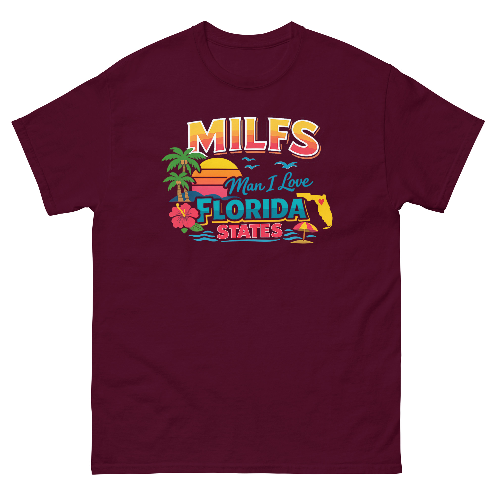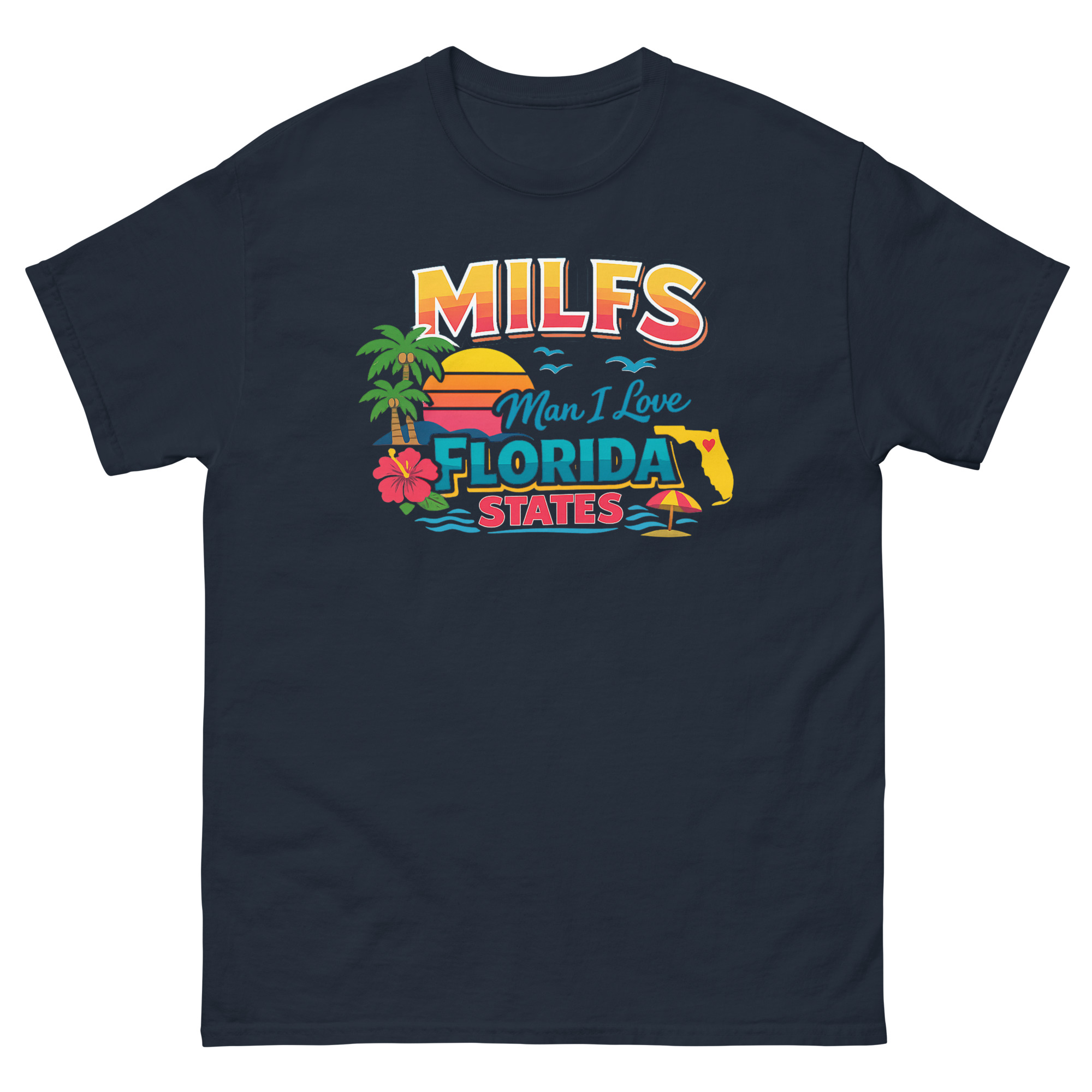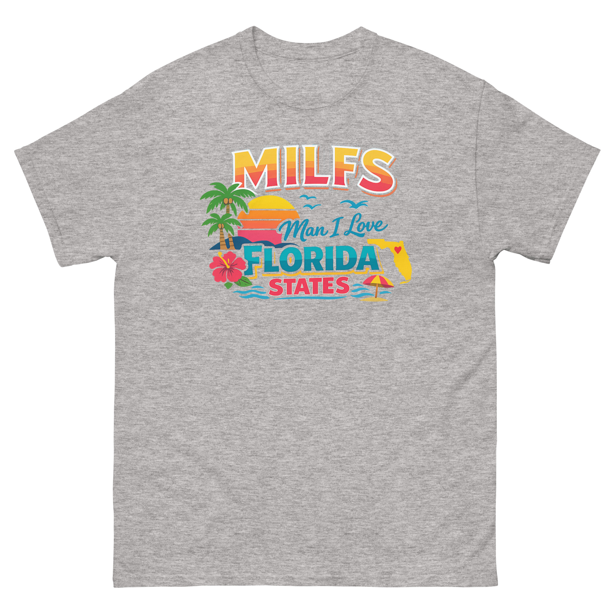 The MILFS Man I Love Florida States T Shirt is a vibrant, retro-styled tee that celebrates life in the Sunshine State with a humorous twist. Its unique design packs iconic Florida imagery, palm trees, a sunset, and a state map, into a bold, colorful graphic. This shirt is made for Florida residents, vacationers, and anyone who loves Gulf Coast vibes and a clever inside joke.