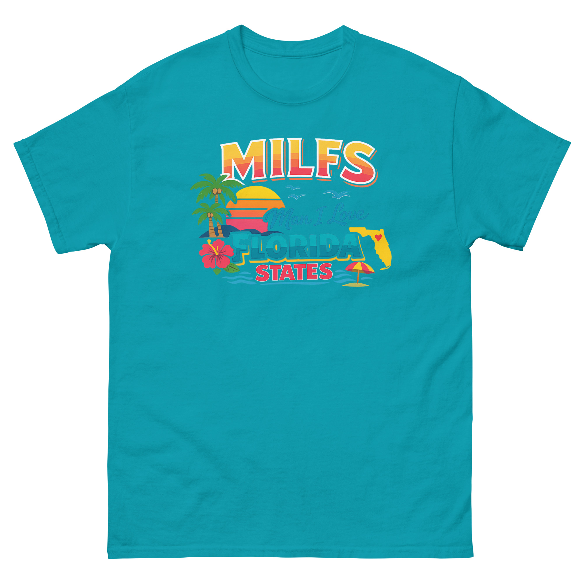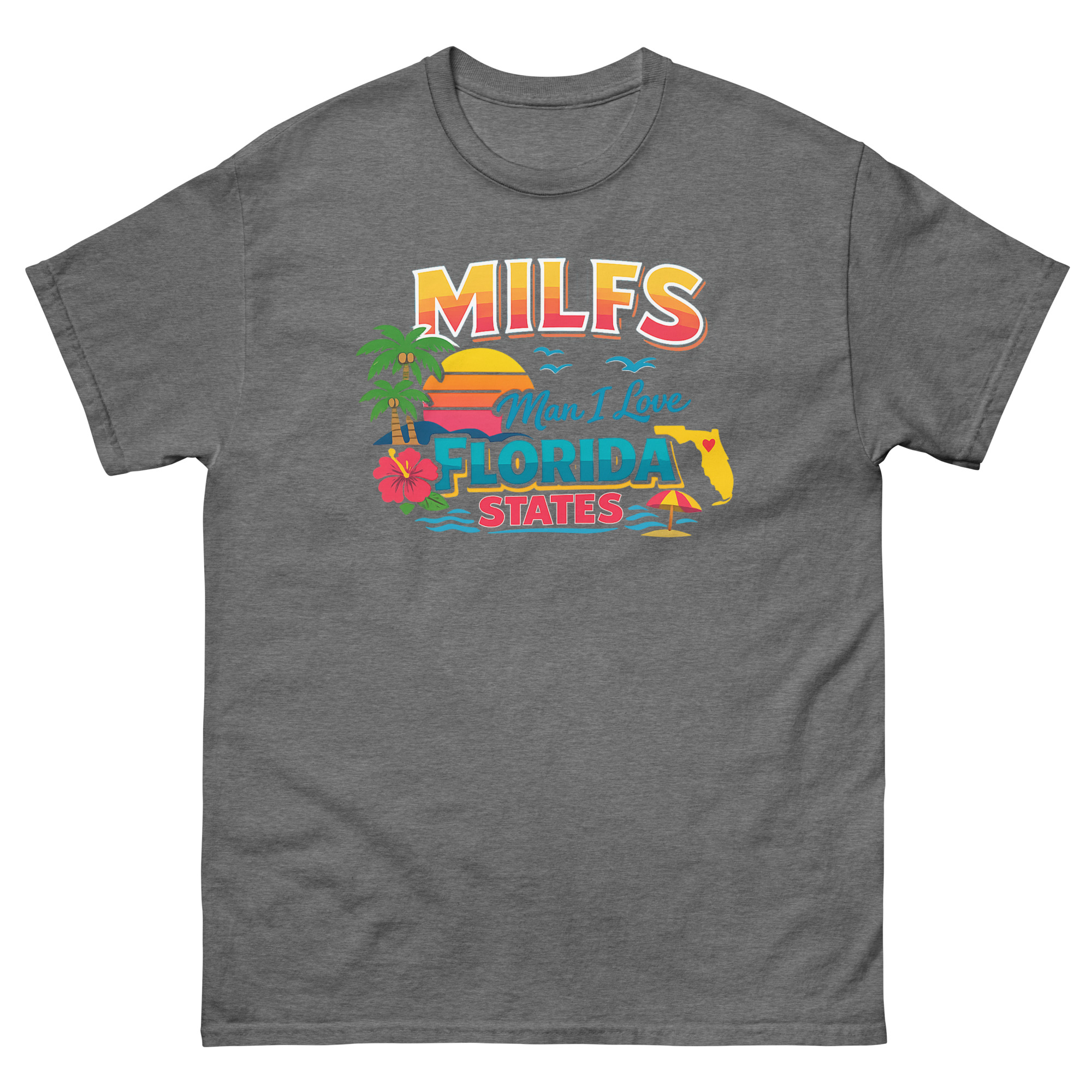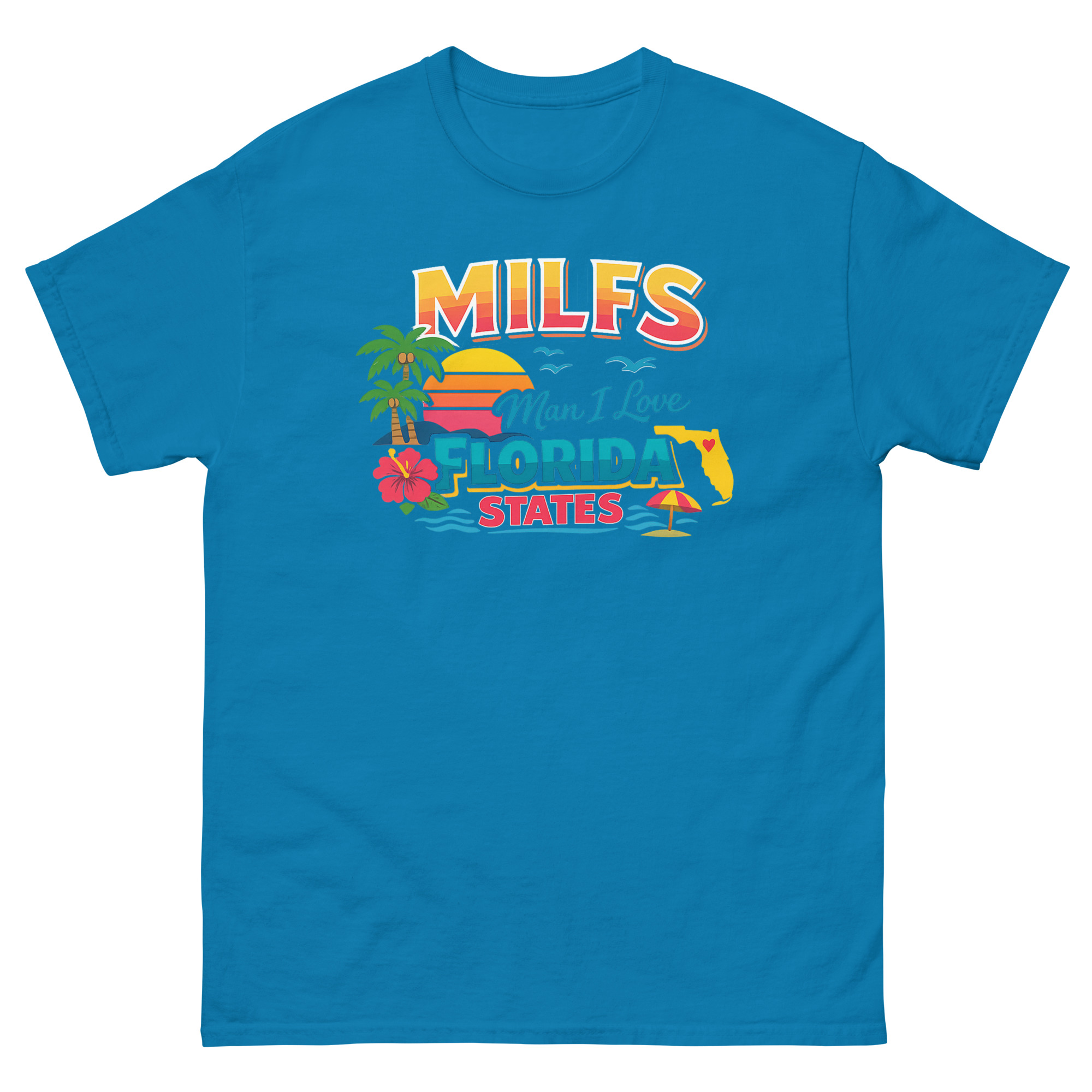 The MILFS Man I Love Florida States T Shirt is a vibrant, retro-styled tee that celebrates life in the Sunshine State with a humorous twist. Its unique design packs iconic Florida imagery, palm trees, a sunset, and a state map, into a bold, colorful graphic. This shirt is made for Florida residents, vacationers, and anyone who loves Gulf Coast vibes and a clever inside joke.