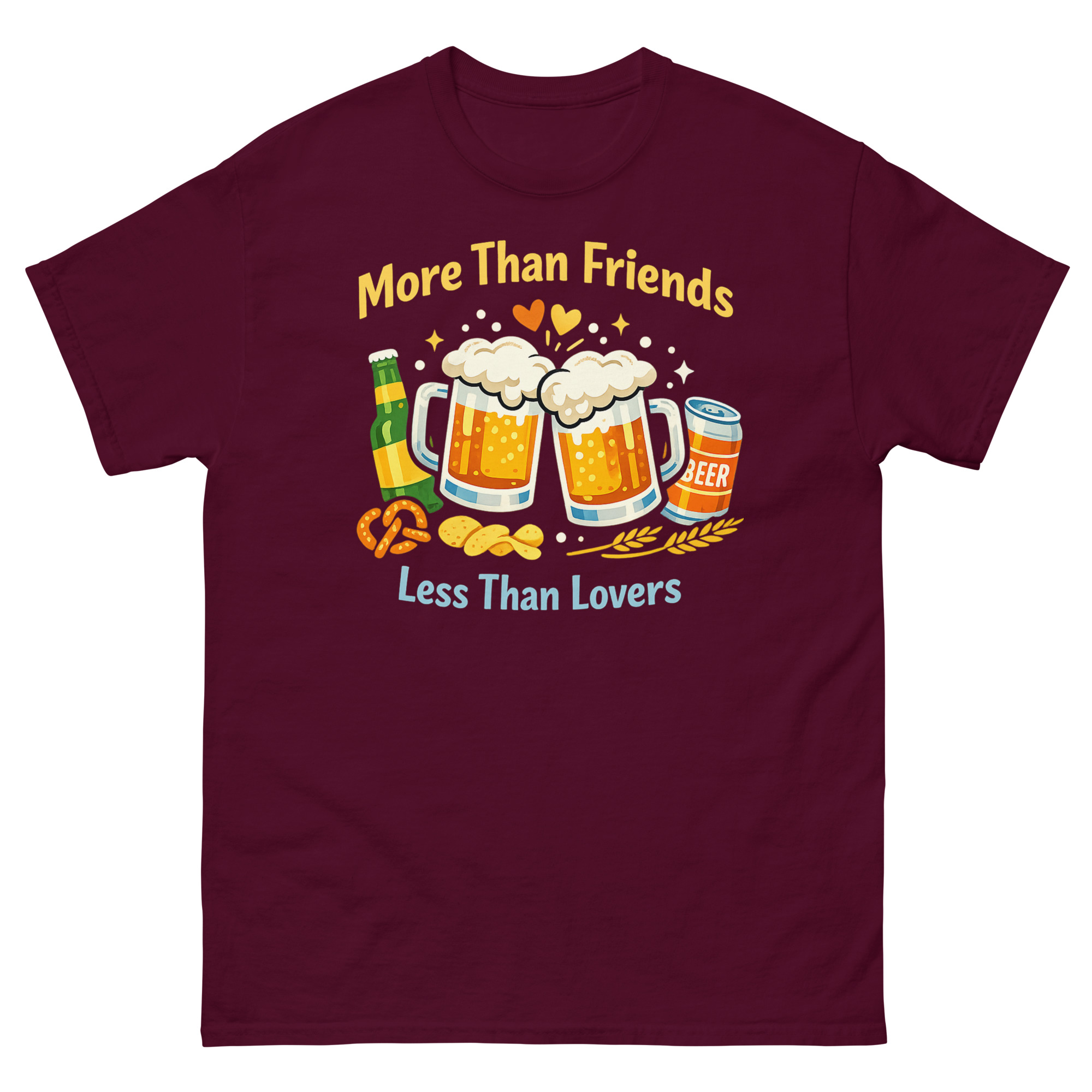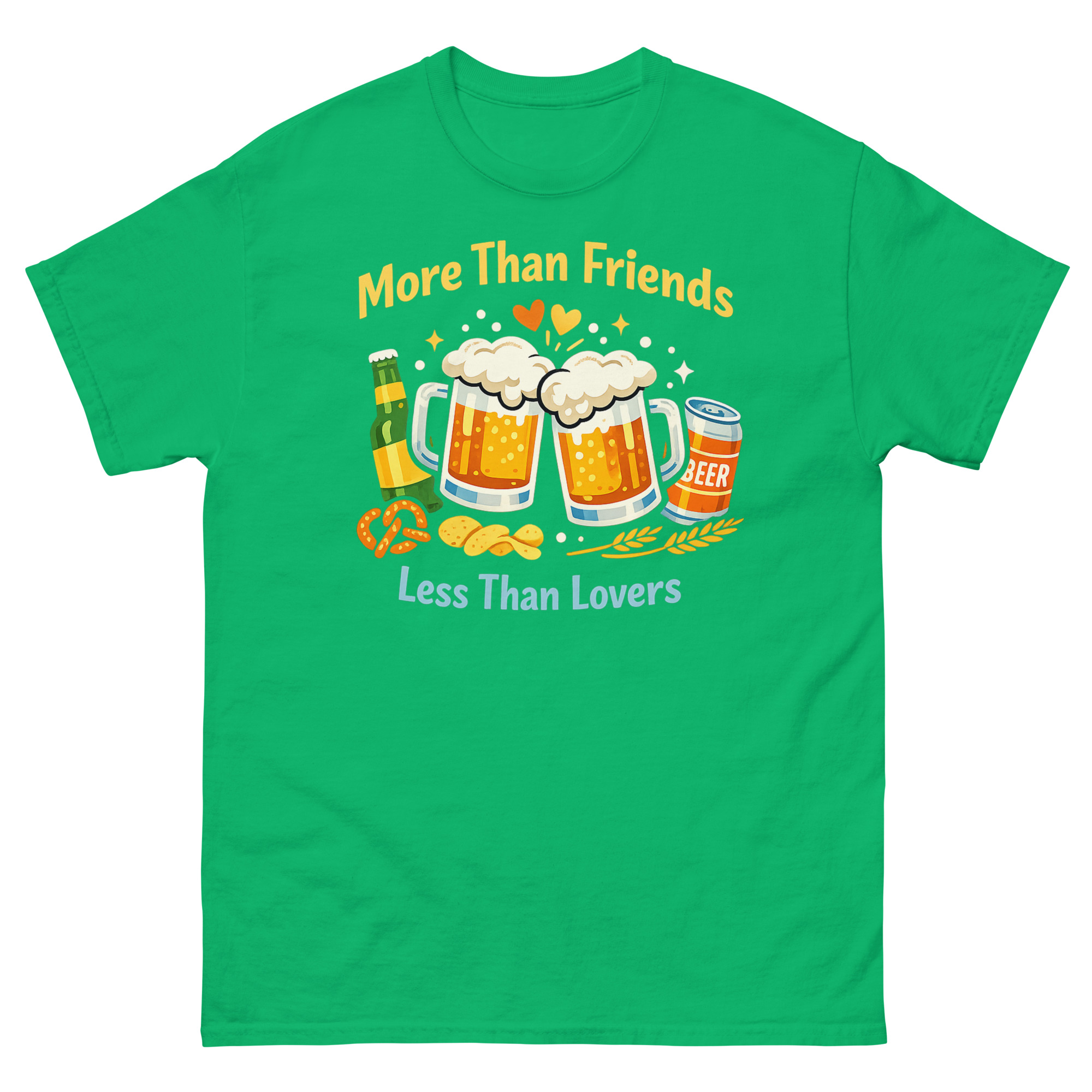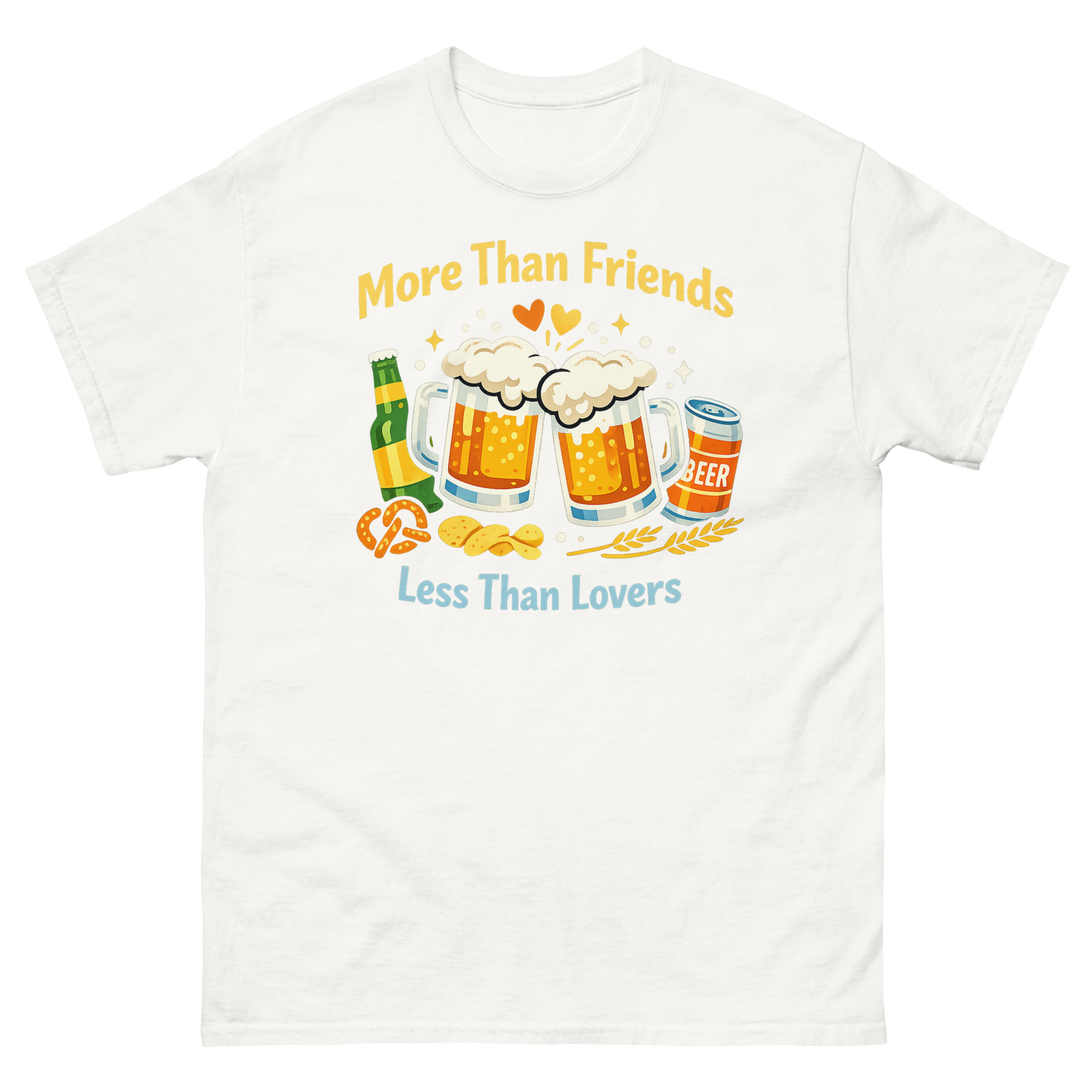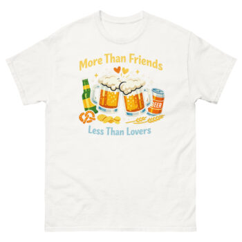 Look closely at the vibrant cartoon on your chest. You’ll see two frothy beer mugs in a joyful cheers, surrounded by a green bottle, an orange can, and a spread of salty pretzels and chips. The words “More Than Friends” curve warmly above, while “Less Than Lovers” sits coolly below. Accented with little hearts and stars, the design screams affection, just the boozy, platonic kind.
