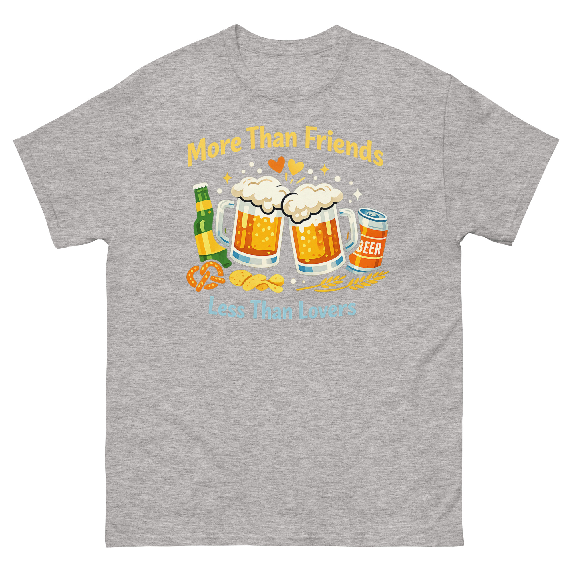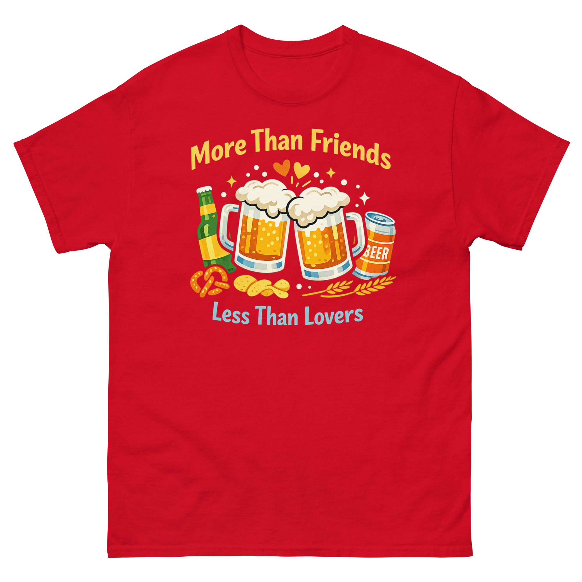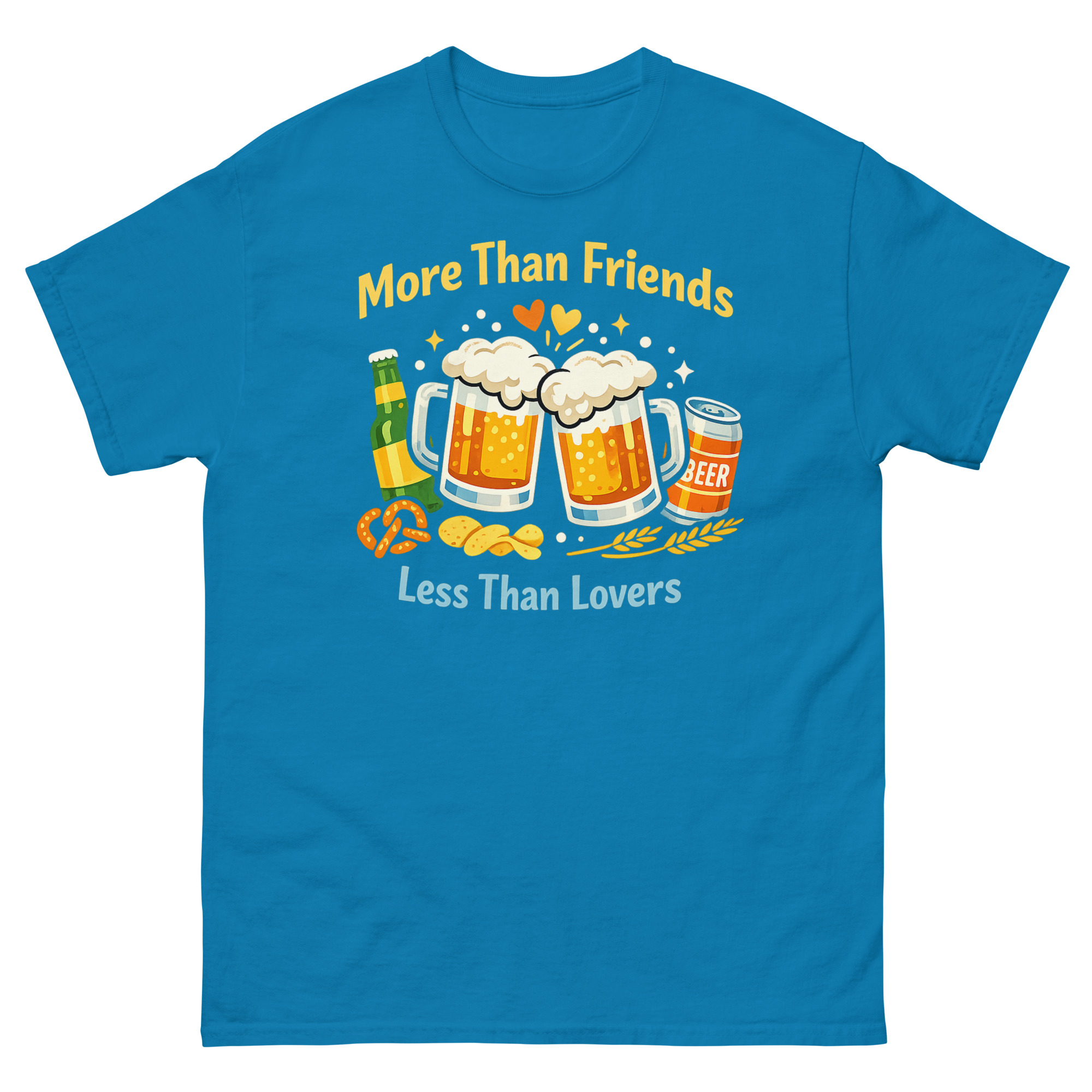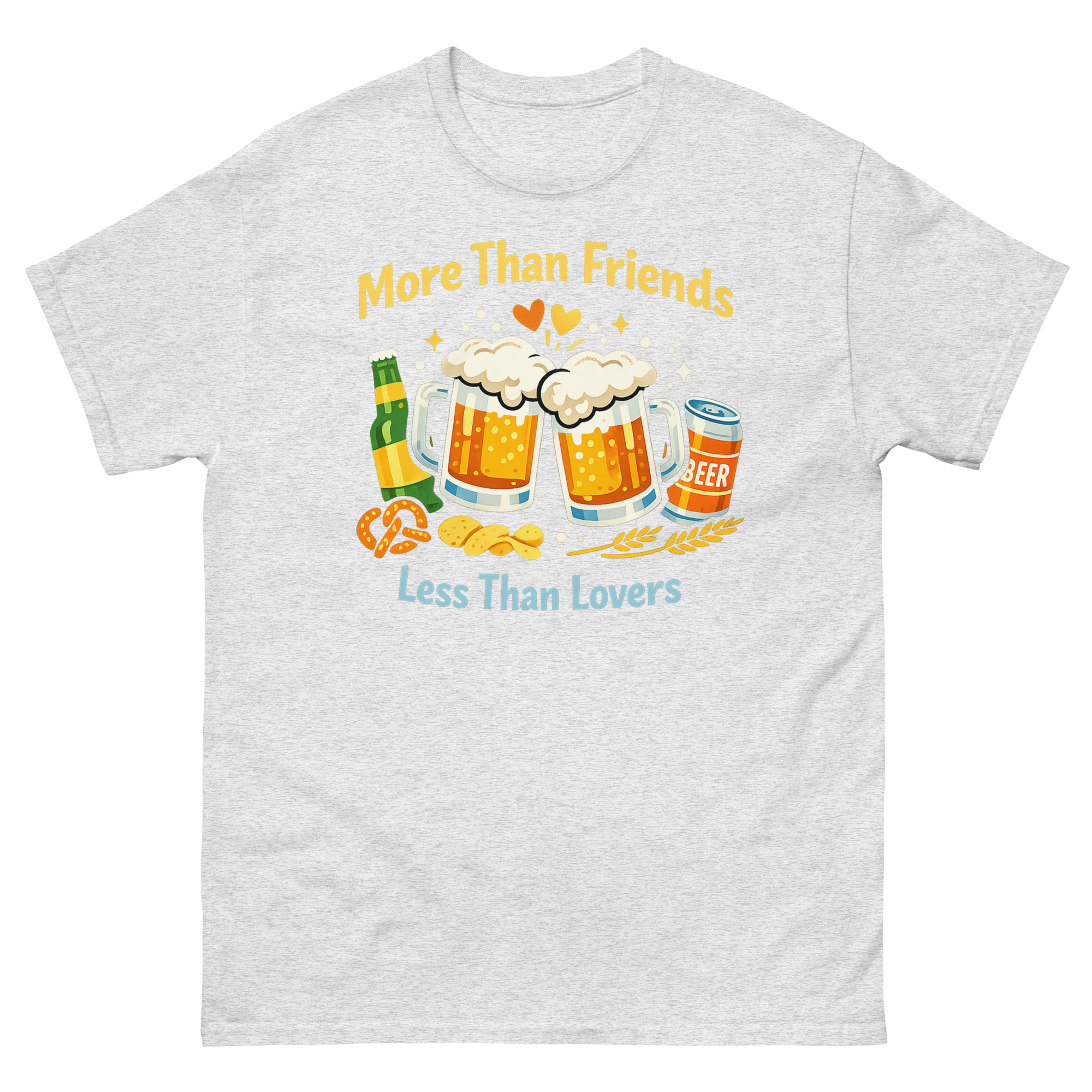 Look closely at the vibrant cartoon on your chest. You’ll see two frothy beer mugs in a joyful cheers, surrounded by a green bottle, an orange can, and a spread of salty pretzels and chips. The words “More Than Friends” curve warmly above, while “Less Than Lovers” sits coolly below. Accented with little hearts and stars, the design screams affection, just the boozy, platonic kind.