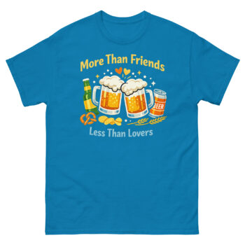 Let’s be honest. Being stuck in relationship limbo is a total head-scratcher. But what if we told you it doesn’t have to be about romance at all? Sometimes, the truest bond is forged not over candlelit dinners, but over clinking mugs and shared pub snacks. This “More Than Friends, Less Than Lovers” shirt isn’t about complicated situationships. Instead, it’s a hilarious and heartfelt tribute to your platonic soulmate, your ultimate drinking buddy.