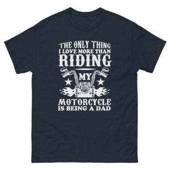 The bold white text declares: “The only thing I love more than riding my motorcycle is being a dad.” This sentimental biker dad t shirt isn’t just clothing—it’s a conversation starter. It resonates with fathers who refuse to choose between their love for riding and their devotion to their kids.
