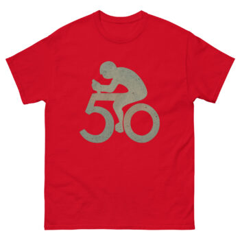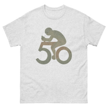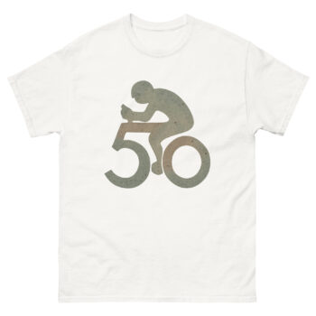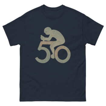 Forget the loud, cliché graphics that scream for attention. True riders understand that confidence is quiet. The genius of this design lies in its sophisticated subtlety. It features a stylized cyclist whose body and bike masterfully form the number “50”—the rider’s torso curves into the “5” while the wheels complete the “0.”
