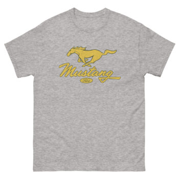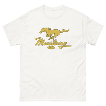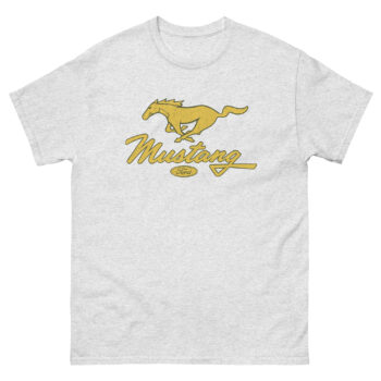 Therefore, we chose the powerful symbol of the galloping horse, rendered in a bold, gold silhouette. This isn’t just a picture; it’s a statement of motion and untamed energy. Beneath it, the flowing cursive script of “Mustang” echoes the classic branding from the 1960s. This vintage Mustang design immediately connects you to the car’s rich heritage. Ultimately, this vintage Ford Mustang apparel for collectors is a tribute to the purity of the original vision.