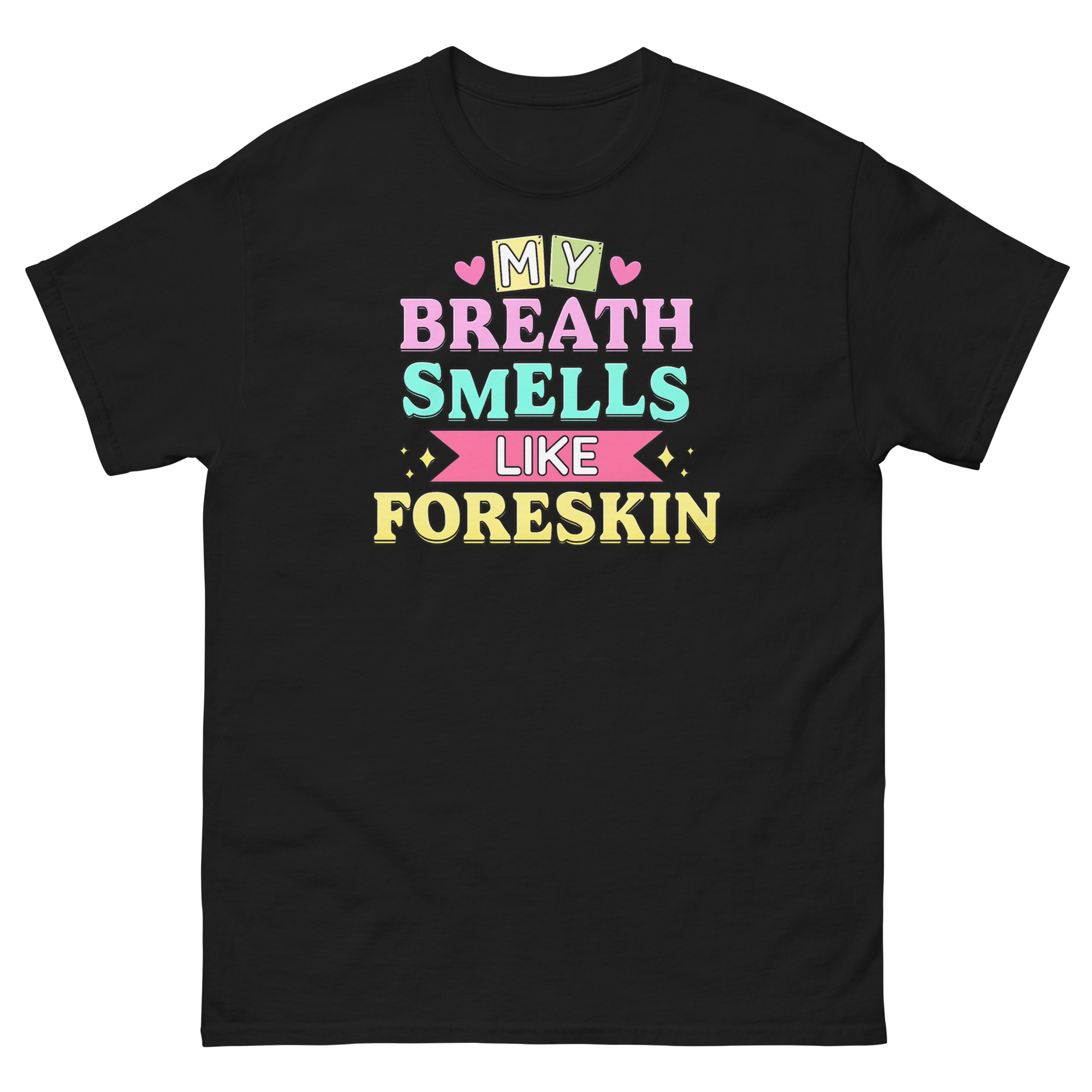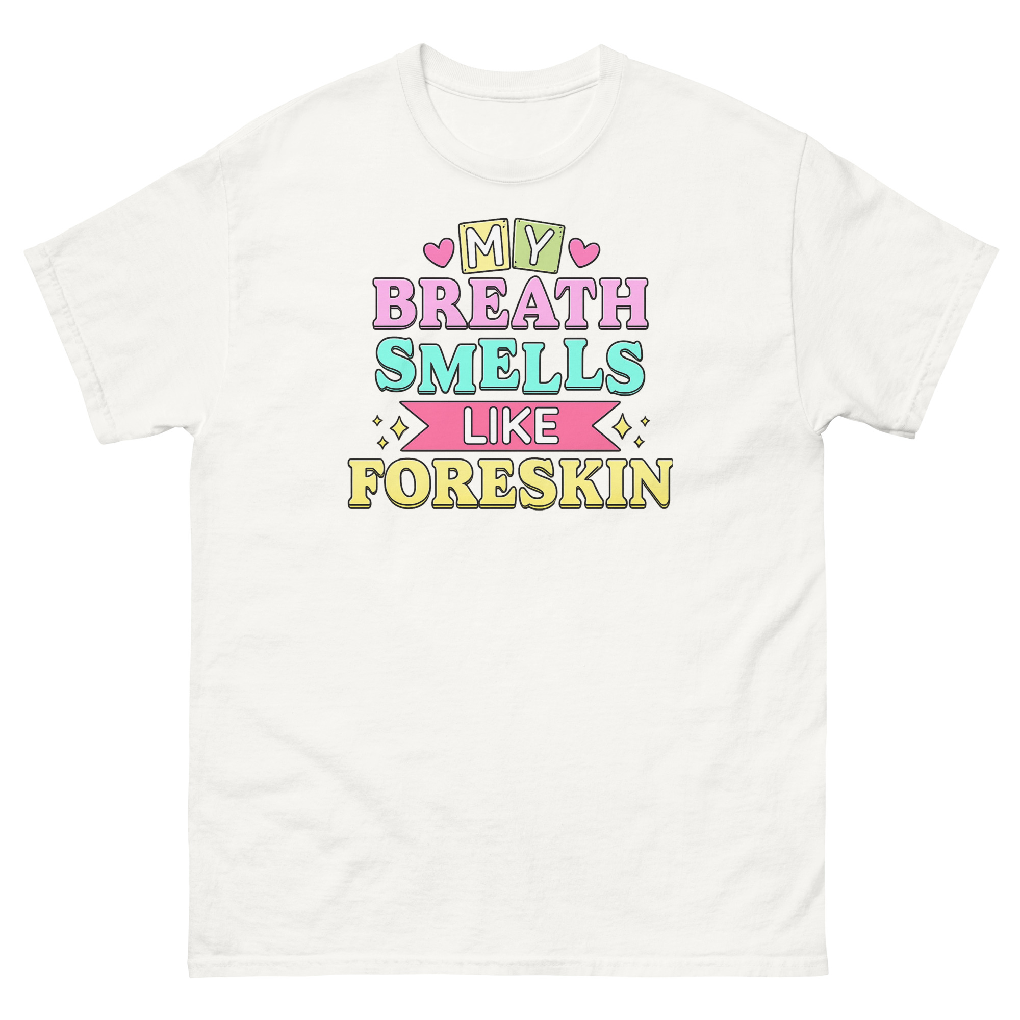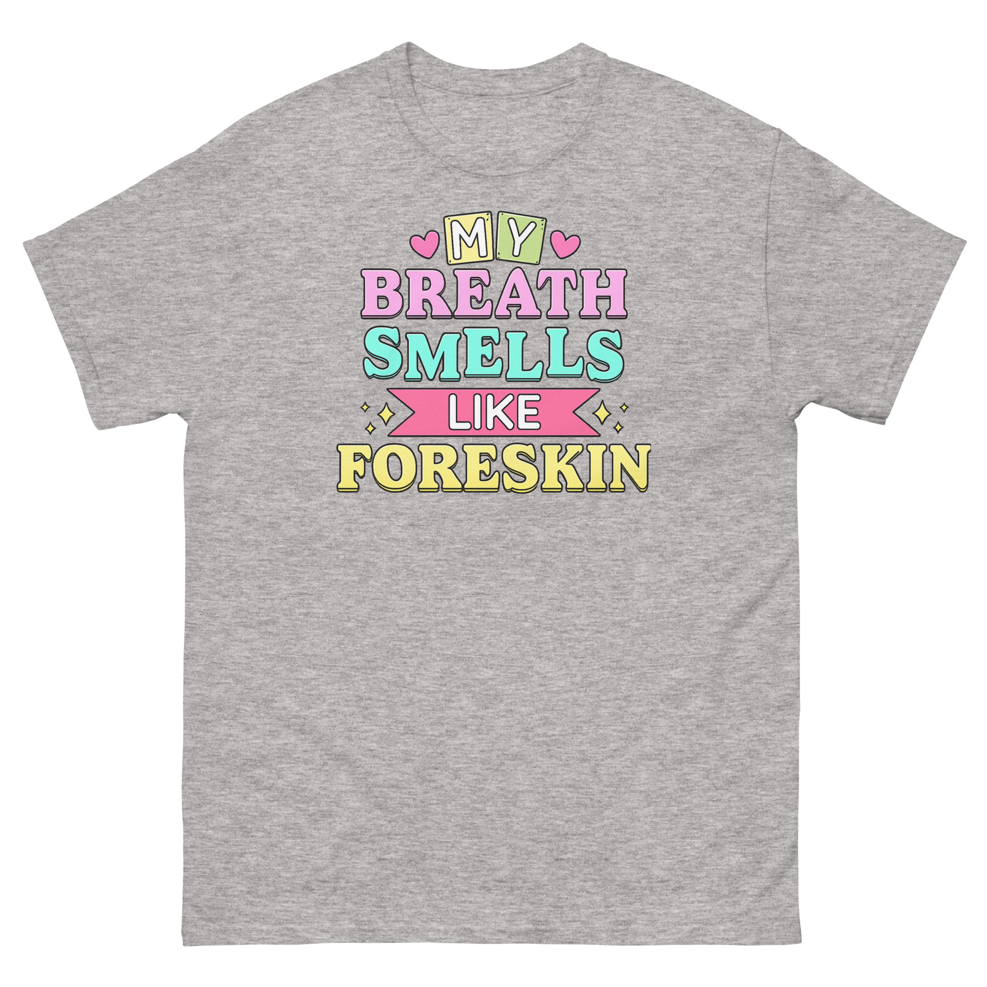 This My Breath Smells Like Foreskin T Shirt is a classic cotton tee featuring a deliberately shocking phrase styled with deceptively cute graphics. Its unique power comes from the jarring clash between sweet, pastel visuals and a blatantly gross-out joke. Designed for ultimate pranksters, this shirt serves as the most offensive gag gift for white elephant parties or a bold statement piece for those who love boundary-pushing humor.