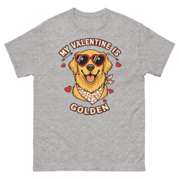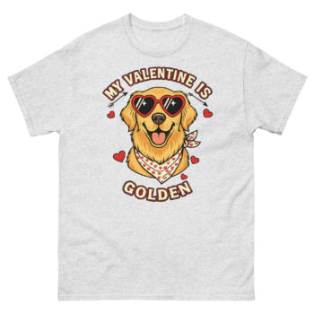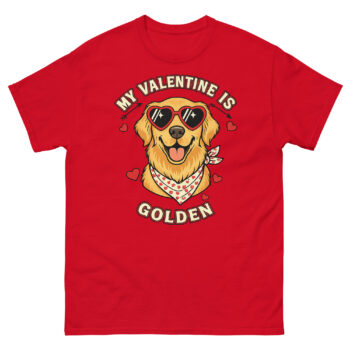 This is a comfortable, classic cotton t-shirt featuring a fun and stylish Valentine’s design for dog lovers. The My Valentine is Golden T Shirt stands out with its retro-cool Golden Retriever illustration wearing heart-shaped sunglasses. It’s the perfect top for Golden Retriever owners and pet parents who want to celebrate the holiday with their furry best friend.