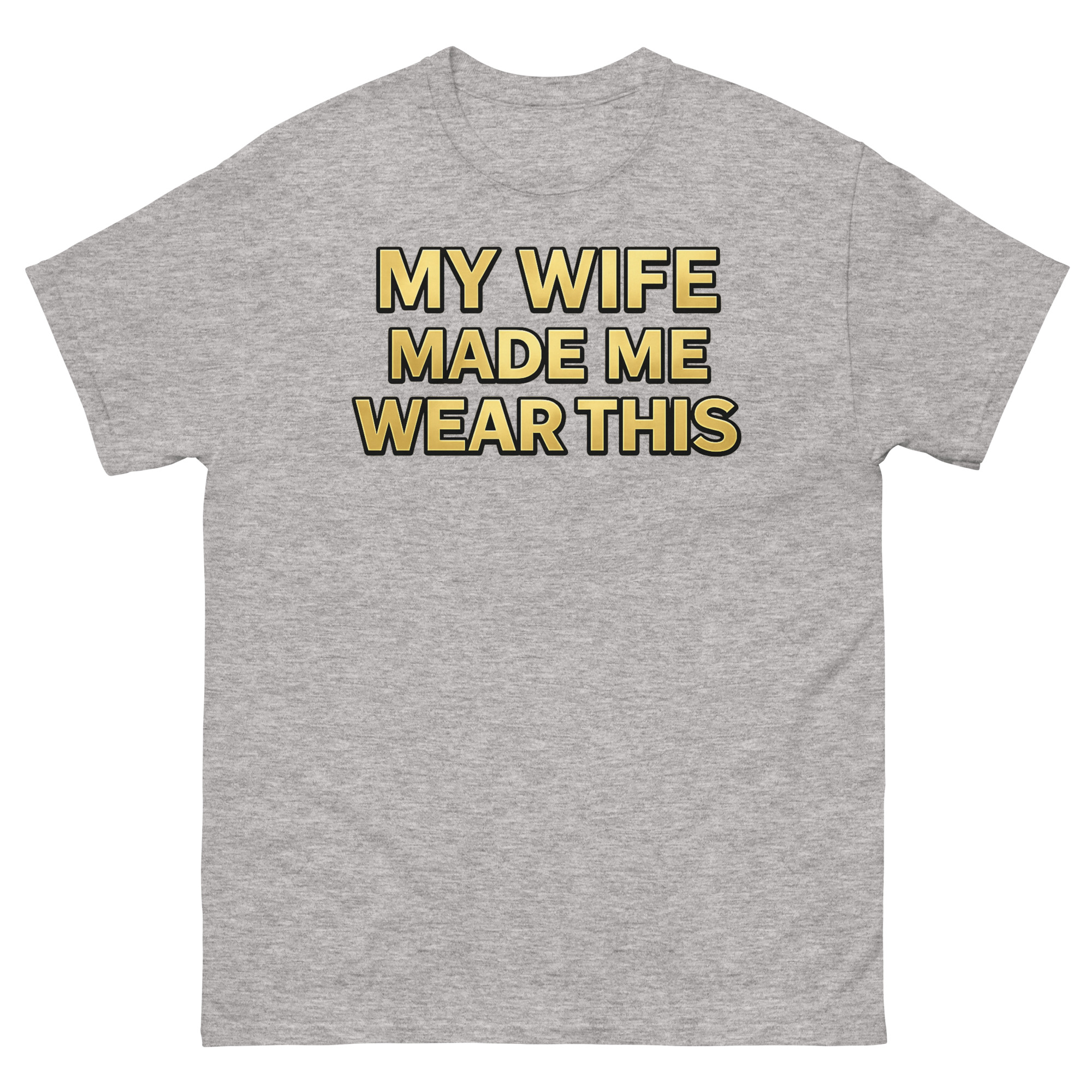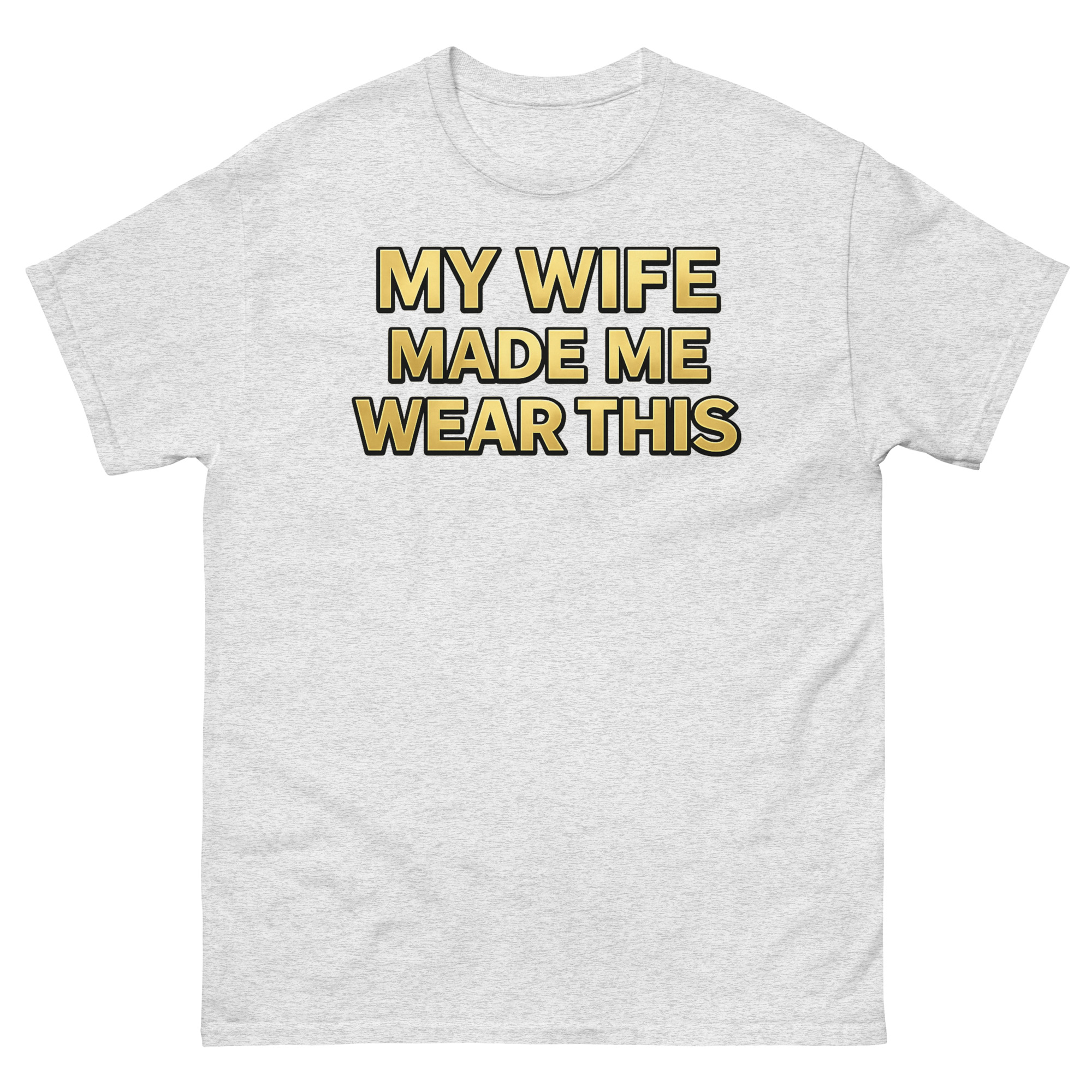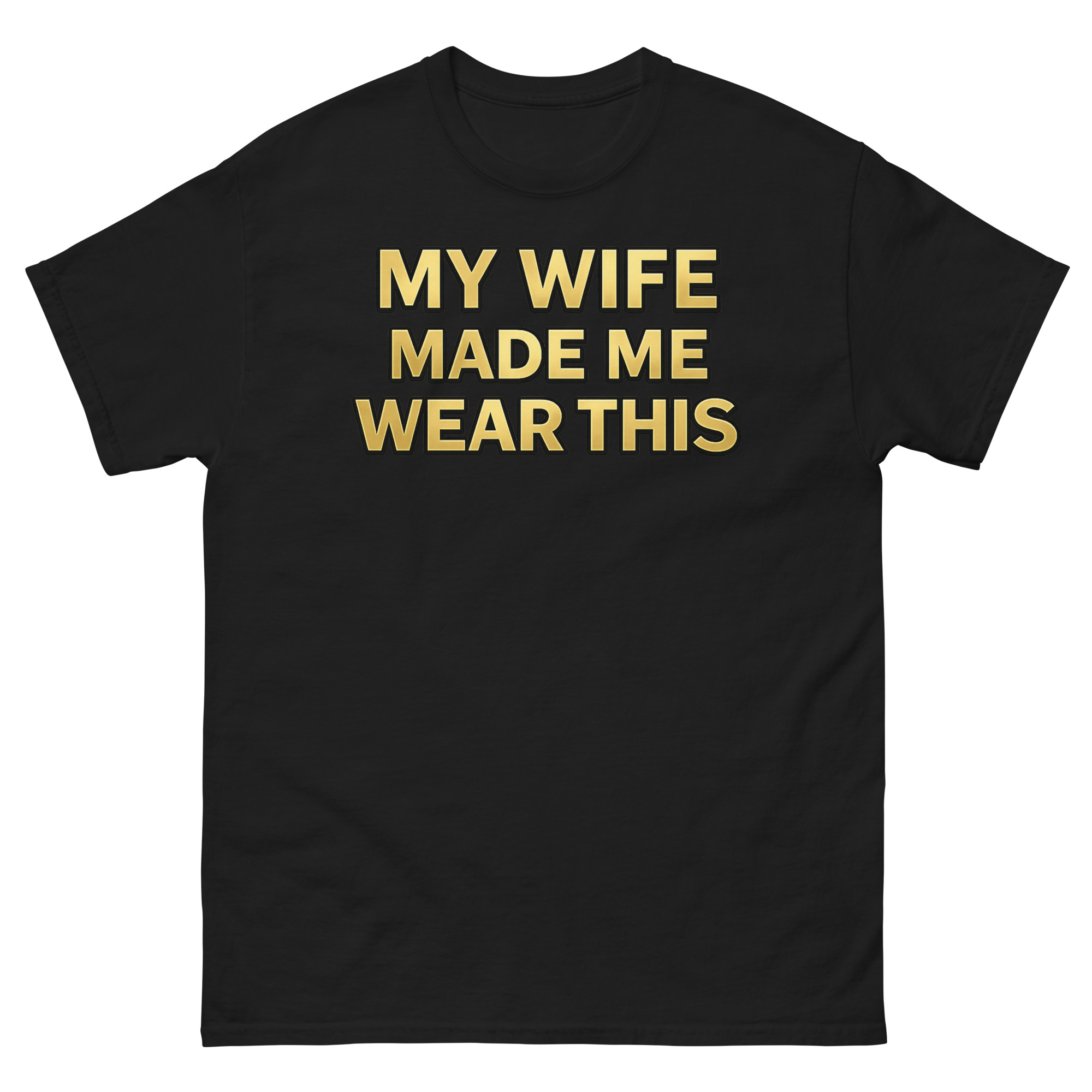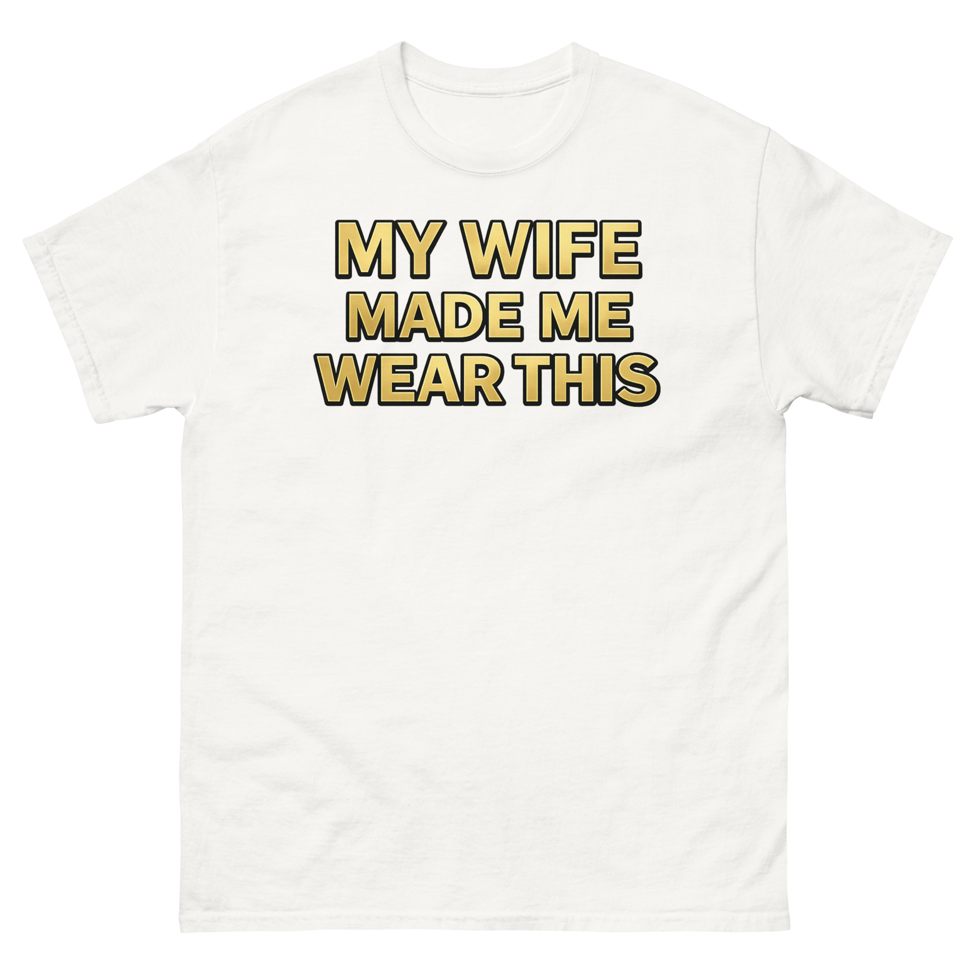 My Wife Made Me Wear This Shirt – Funny Gold Lettered Graphic Tee for Husbands