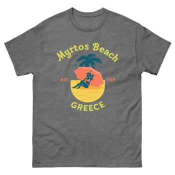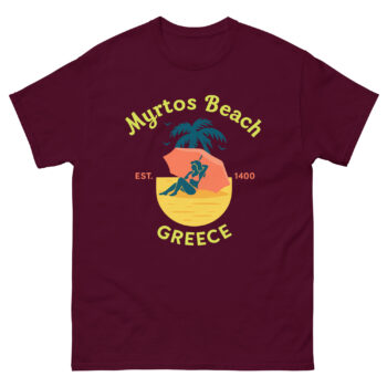 A Nod to the Location: Anchoring the design, “GREECE” is displayed in a clean, complementary font, ensuring your Myrtos Beach travel apparel is instantly recognizable to fellow travelers and Grecophiles alike. This isn’t just a Kefalonia Myrtos Beach t shirt; it’s a badge of honor for those who have witnessed its beauty.