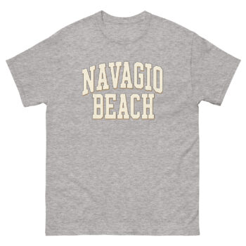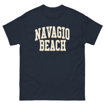 The Look: Featuring a clean, collegiate-style font, the words “NAVAGIO BEACH” stand out in a soft cream color against a deep black background. This classic varsity style feels both timeless and strong, much like the coastal legend itself.