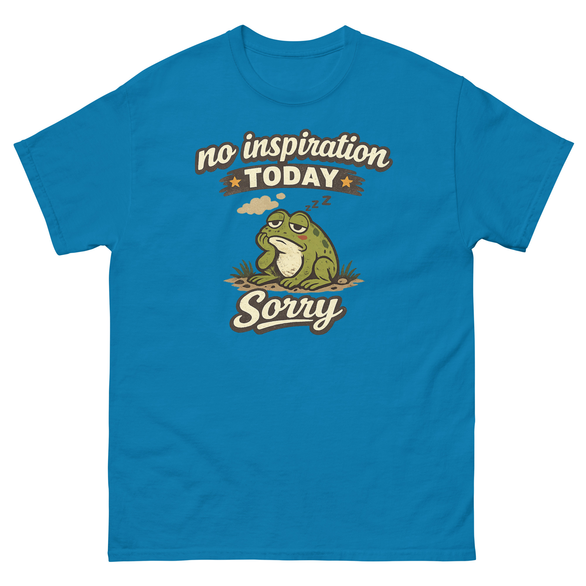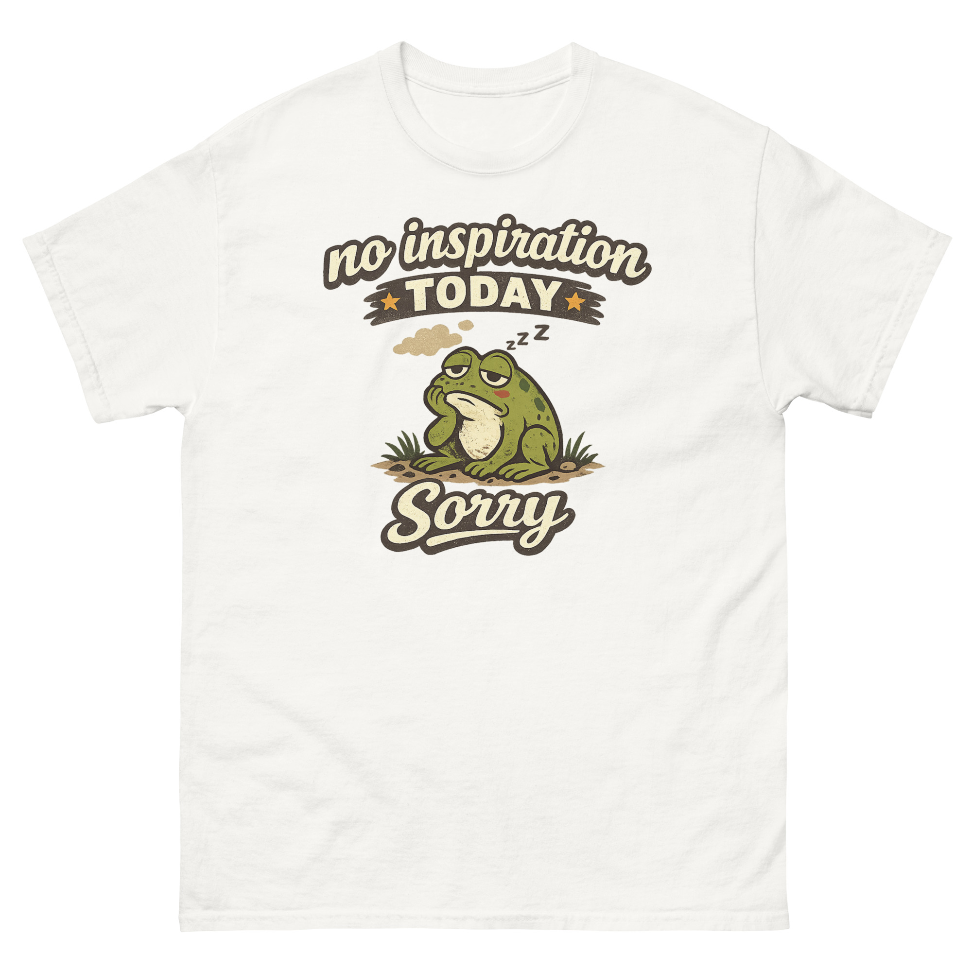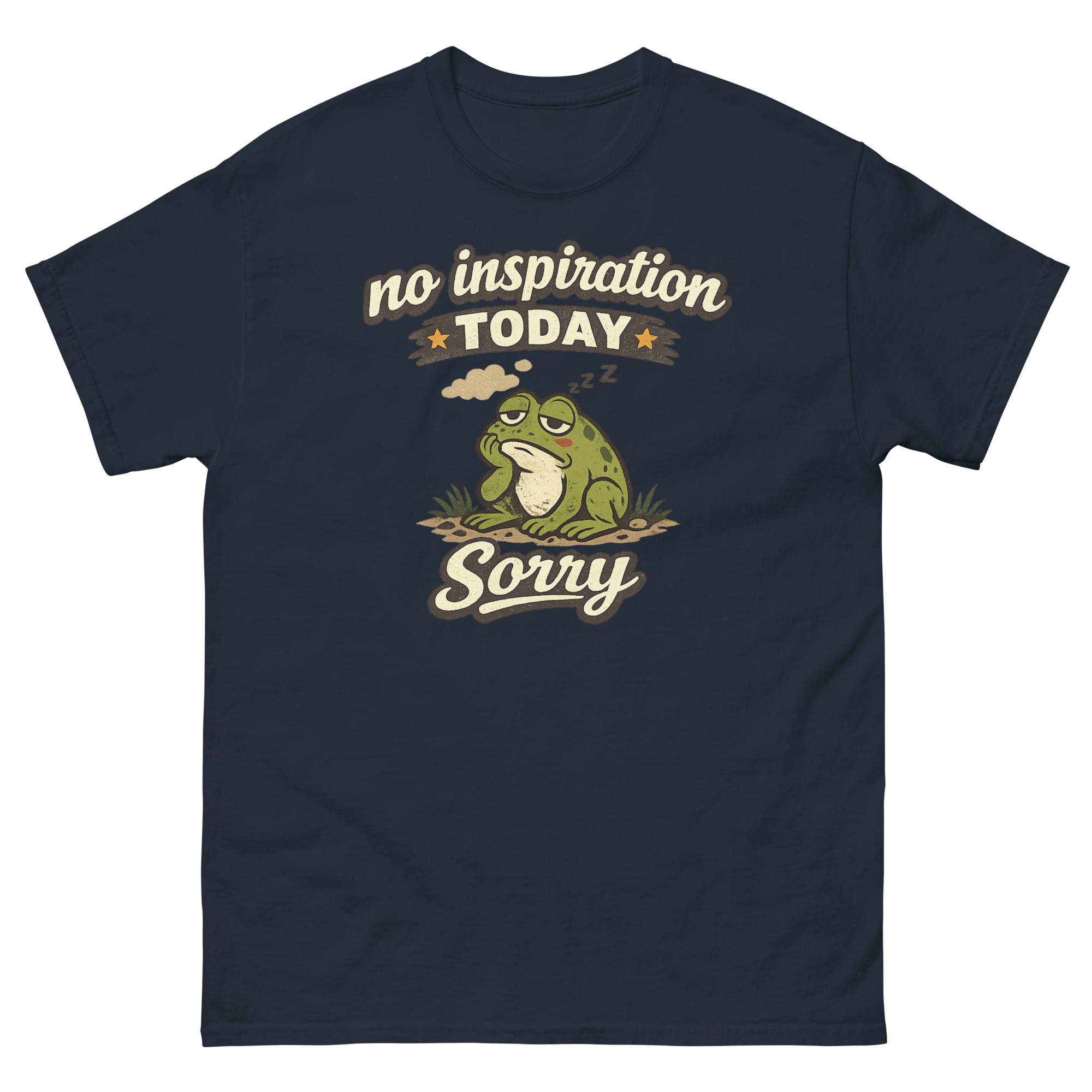 Sometimes, you just don’t have it. The words won’t come, the ideas are stale, and your best move is to simply be. That’s the entire idea behind this design. We started with the concept of an “Authorized Break” and landed on a chubby, dozing frog as the perfect mascot. After all, frogs are experts at sitting still. Consequently, No Inspiration Today Sorry Shirt isn’t just a random cartoon; it’s a specific mood.