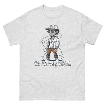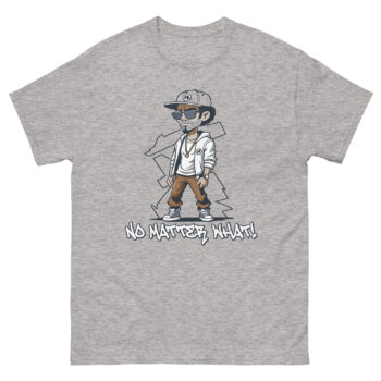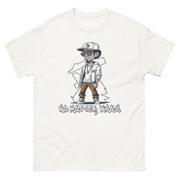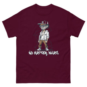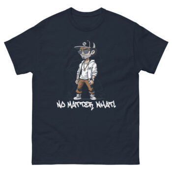 At the center of this urban graphic shirt stands a cartoon-style figure dressed in classic streetwear: black cap, sunglasses, white jacket, brown pants, and black-and-white sneakers. The relaxed pose, one hand in the pocket, the other hanging loose, radiates calm defiance. Beneath the character, the phrase “NO MATTER WHAT!” is printed in graffiti-style white lettering, adding urgency and emotional punch.