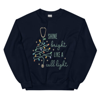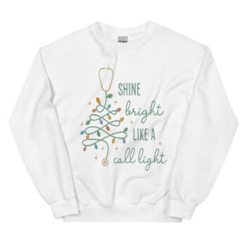 Light up the holidays with this nurse Christmas sweatshirt, featuring a stethoscope and Christmas lights forming a festive tree with the phrase “Shine Bright Like a Call Light.” Perfect for nurses, doctors, and healthcare workers, this cozy pullover makes a thoughtful and funny holiday gift while adding festive spirit to hospital shifts or holiday parties.