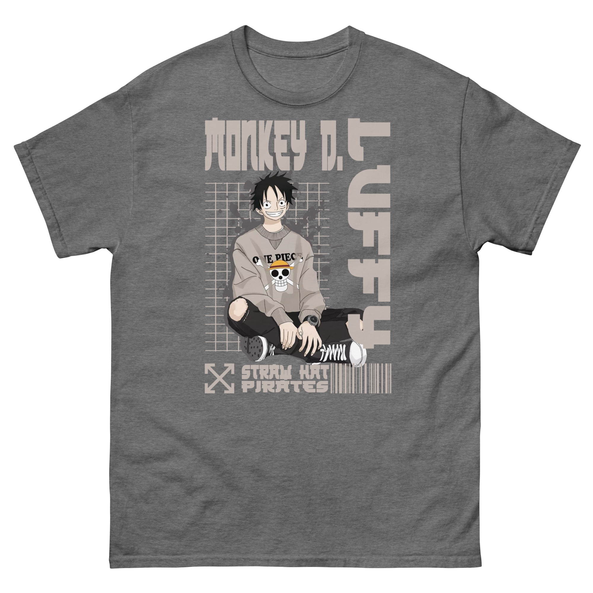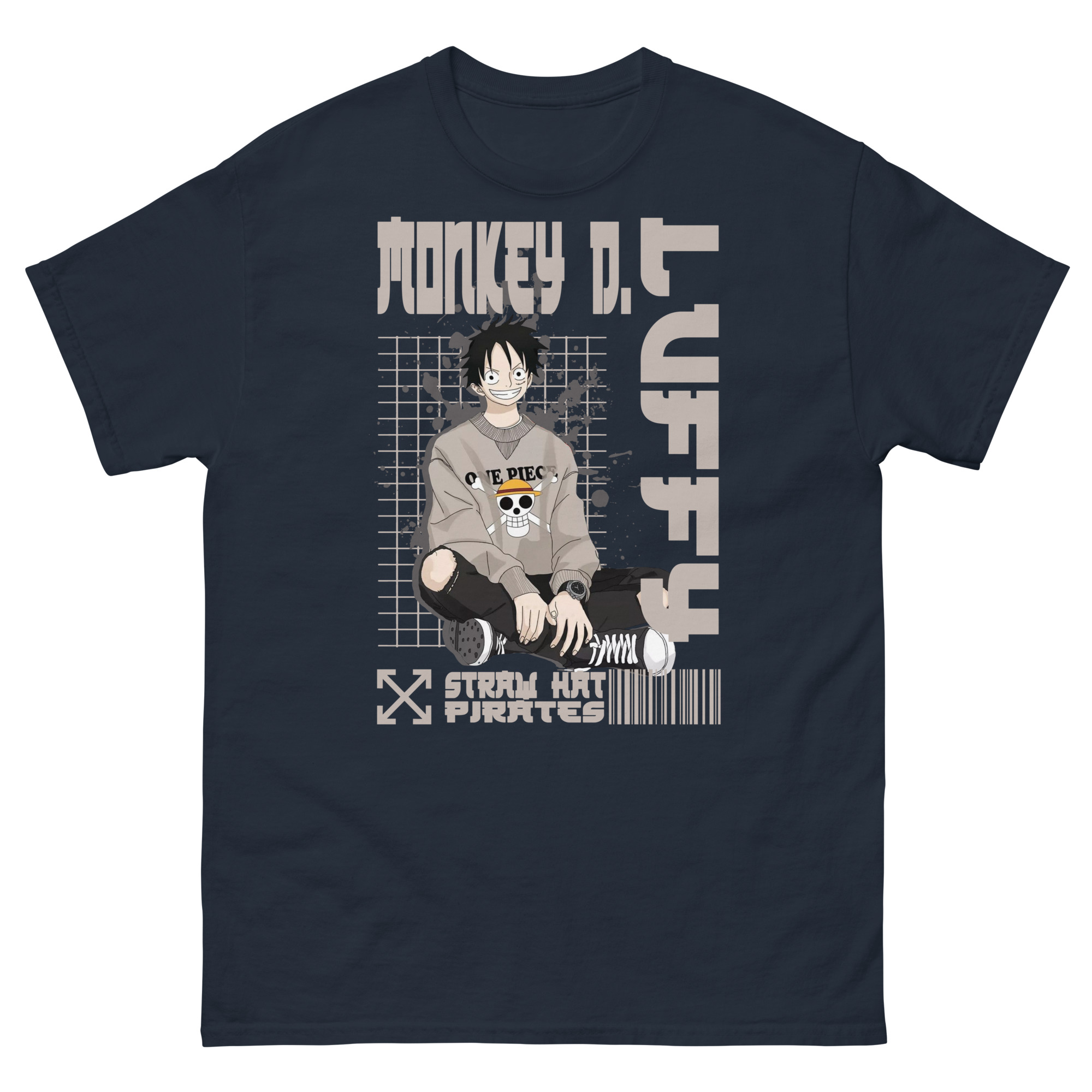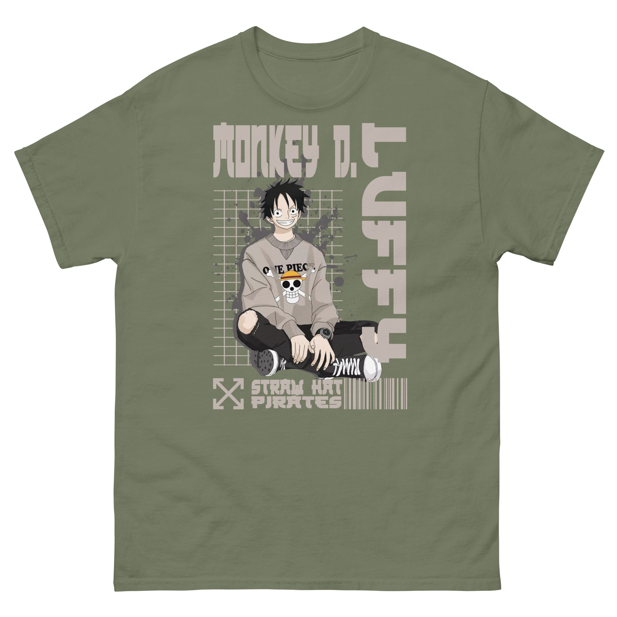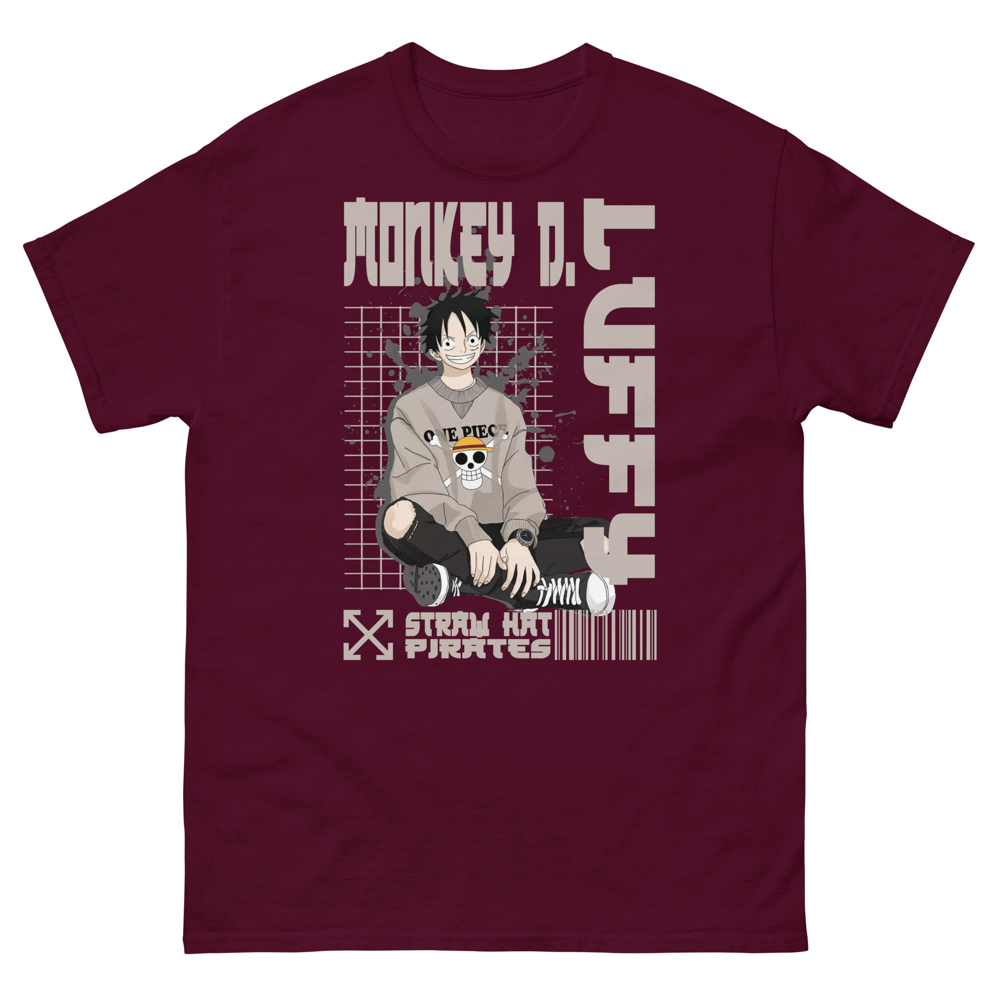 Furthermore, the composition is packed with stylish details. A sharp grid pattern in the background adds a digital, architectural feel, while wispy smoke effects hint at his Gear-powered energy. The bold typography declaring “MONKEY D. LUFFY” and “STRAW HAT PIRATES” acts like a brand logo, complete with a minimalist barcode and directional arrows. These elements signal exclusivity, making this One Piece Straw Hat Shirt feel like a limited-edition drop you won’t find anywhere else.
